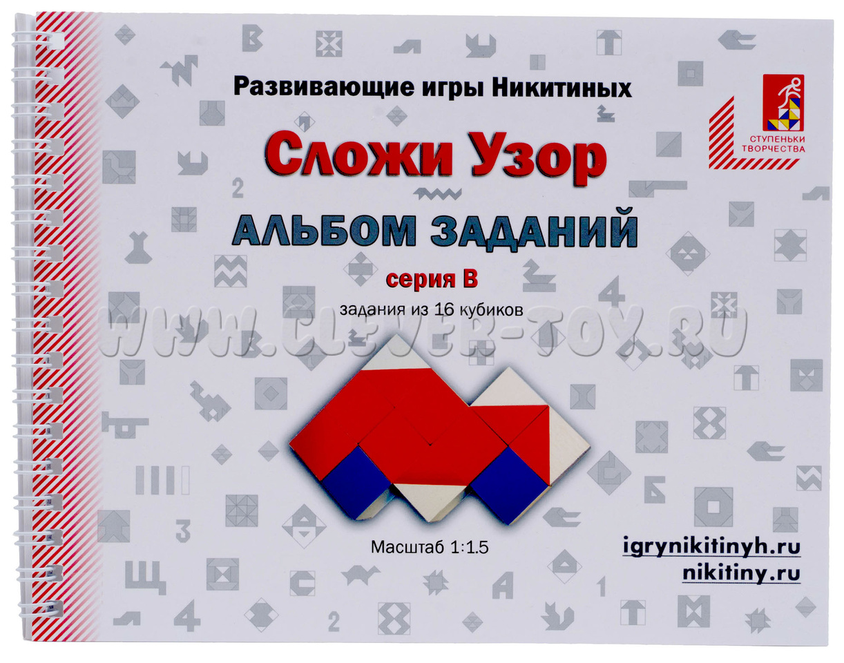 С помощью альбома серии В и кубиков «Сложи узор» ребёнок сможет сложить шахматную доску, домик, песочные часы, дедушку, ракету, звёздочку, маяк, крабика, медаль, красный крест, крюк, автомобиль и более 10-ти геометрических узоров.