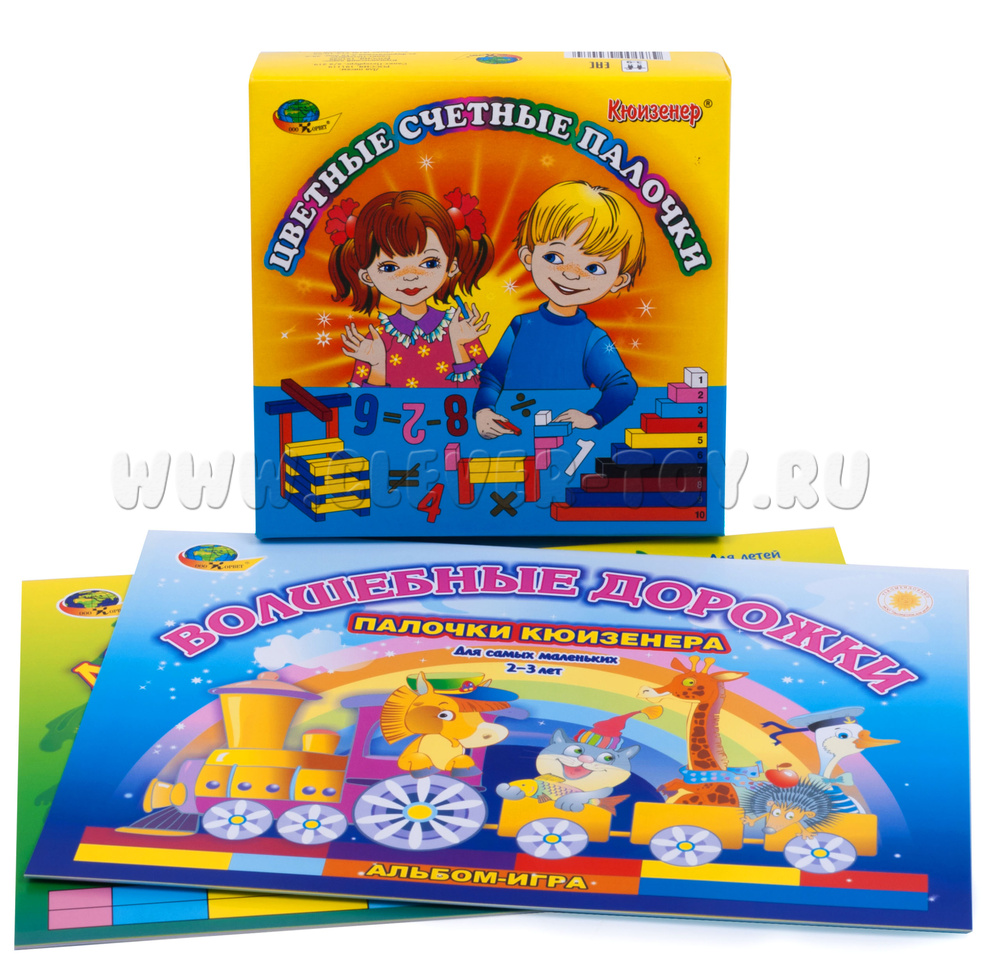 Данный комплект сформирован для детей 2-5 лет и включает в себя одну упаковку палочек Кюизенера и 2 альбома с красочными заданиями.