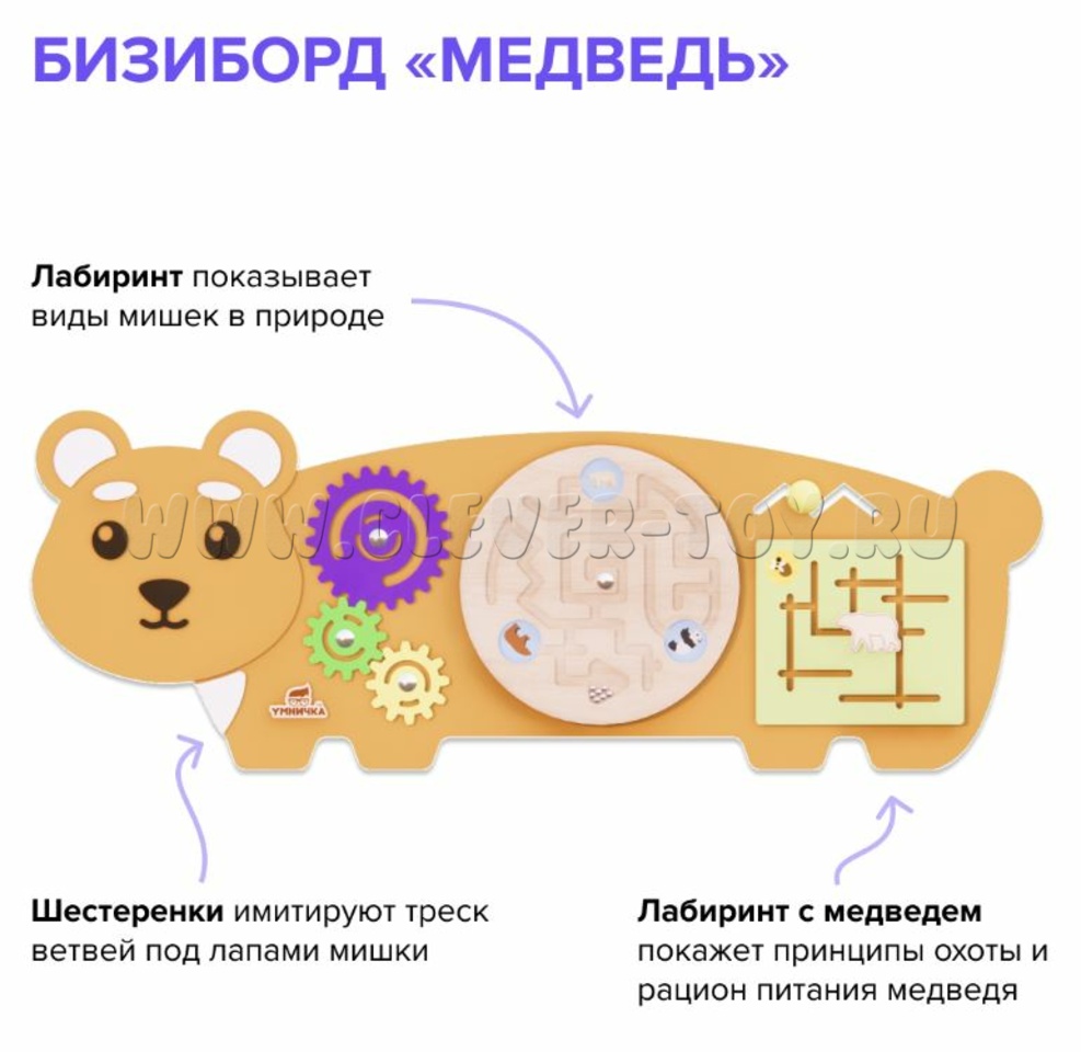 Бизиборд "Медведь" 2.0: Поможет детям узнать о разных видах медведей, развить навыки причинно-следственного мышления, планирования и решения задач благодаря увлекательным лабиринтам и интерактивным элементам.