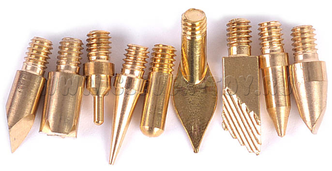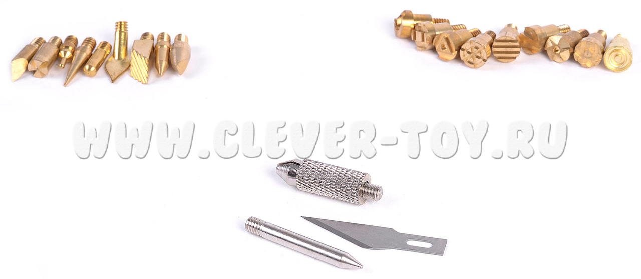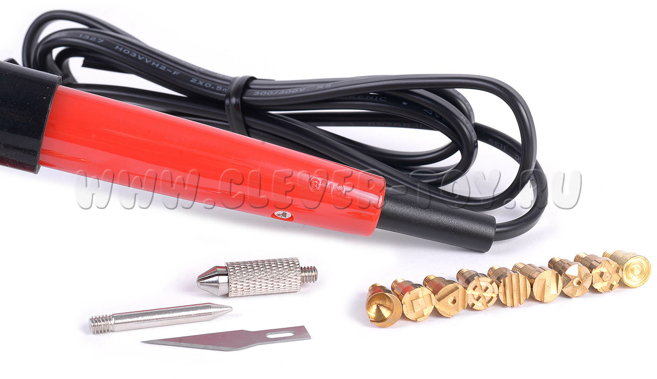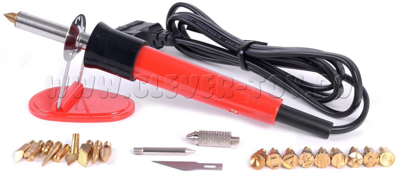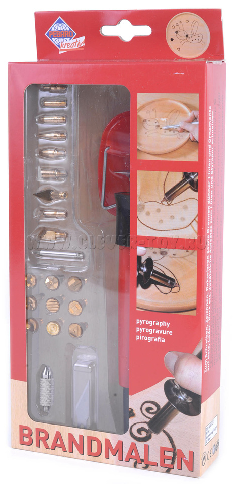 Выжигатель рисует тончайшие линии, с его помощью можно создавать великолепные художественные работы и даже выжигать портреты. Фигурные насадки в комплекте позволят выводить фигурные узоры, переносить самые смелые идеи и яркие фантазии на полотно. Выжигает на любых породах древесины. К комплекту прилагается инструкция, доступно объясняющая принцип работы прибора.