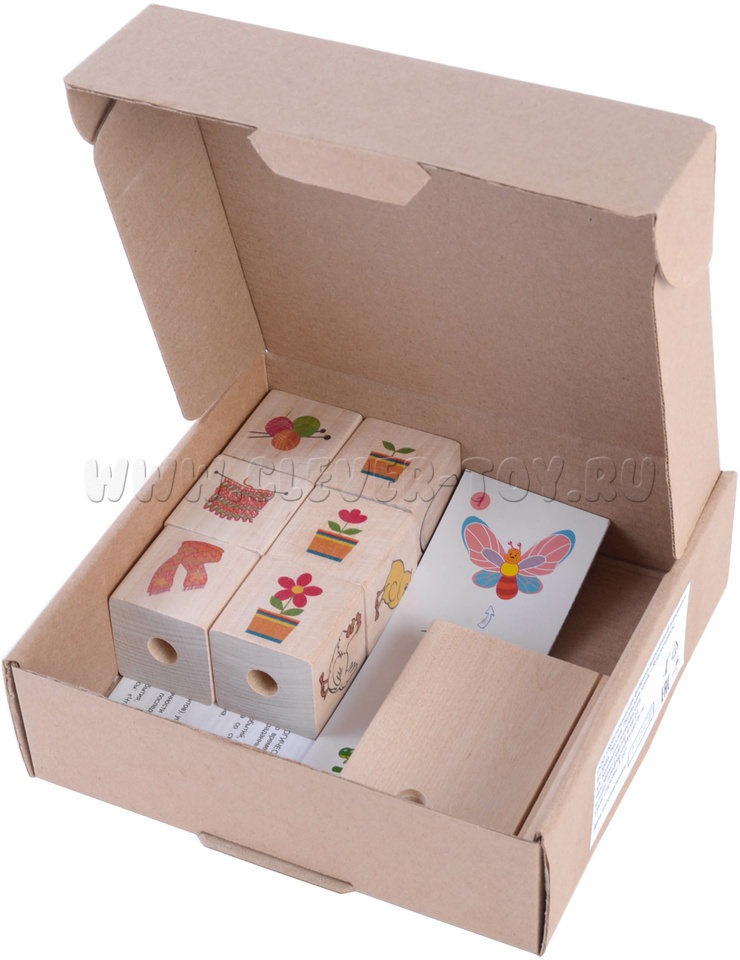 • 6 кубиков (4*4*4 см) с изображениями различных событий, разделённых на три последовательных состояния (ДО и ПОСЛЕ);