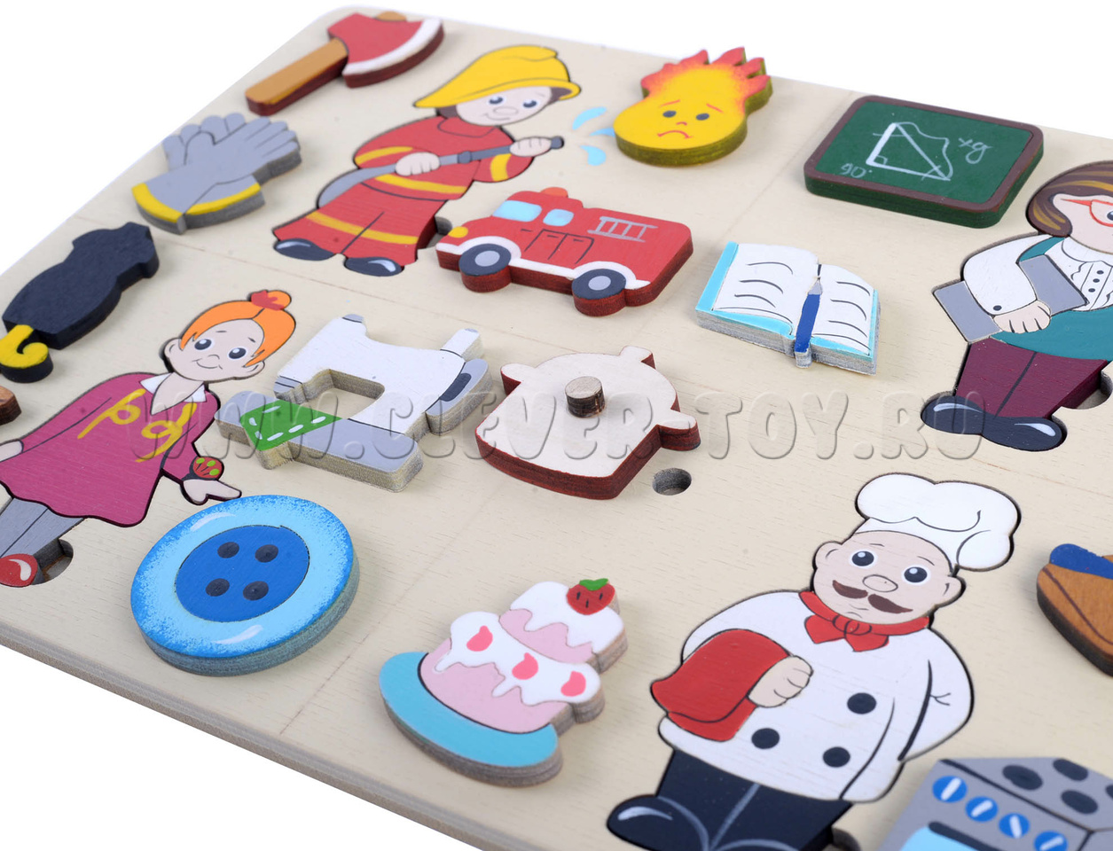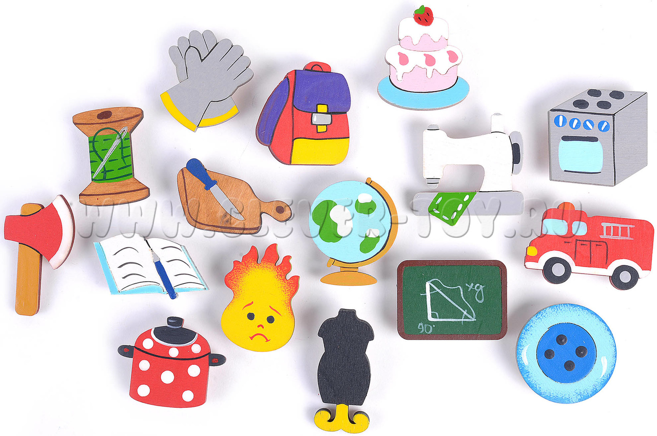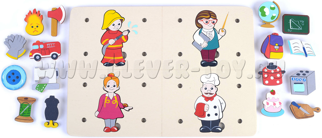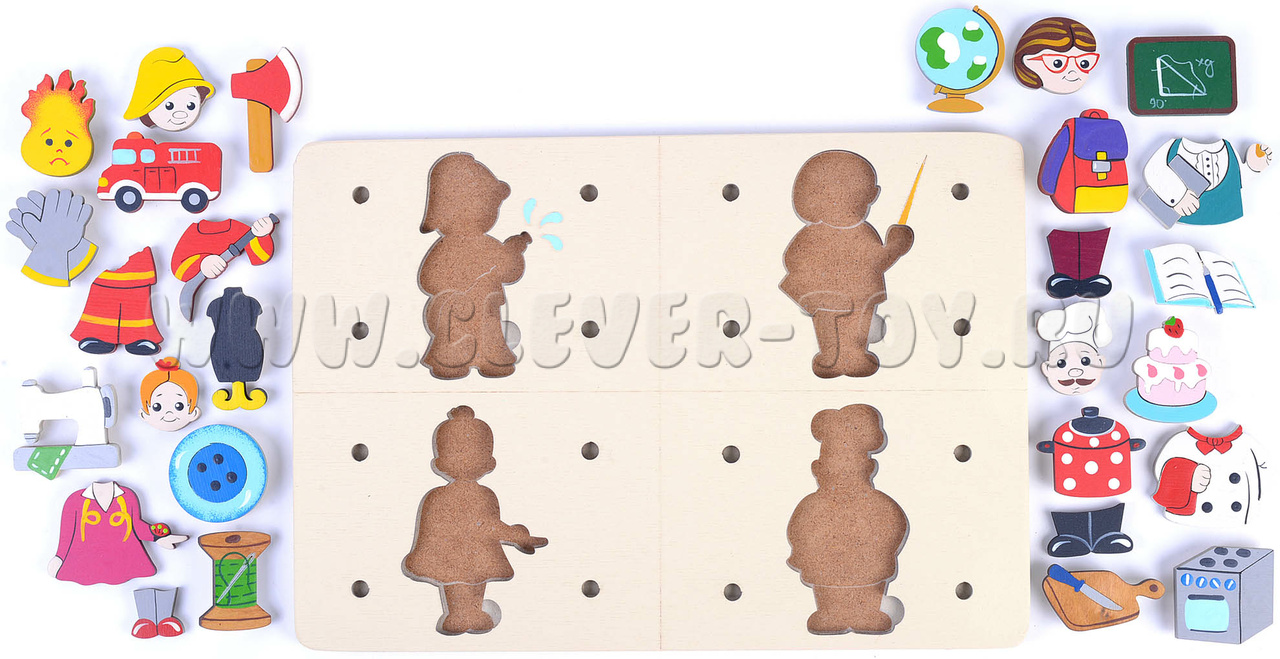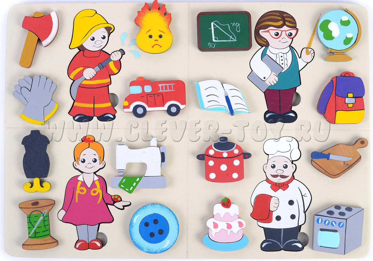 • Фигурки людей 4-х профессий (вкладываются в рамку, составные):Пожарный, Учитель, Швея, повар;
