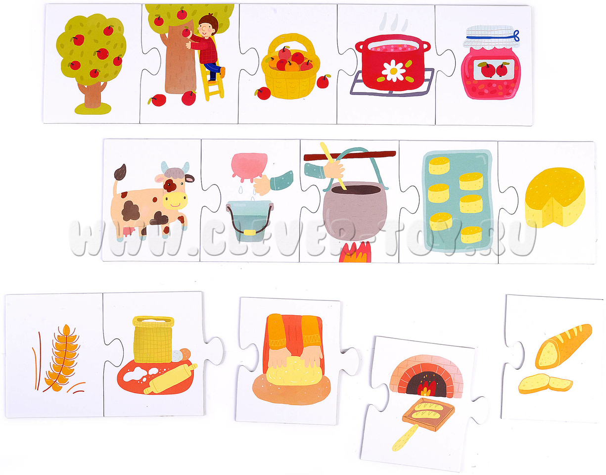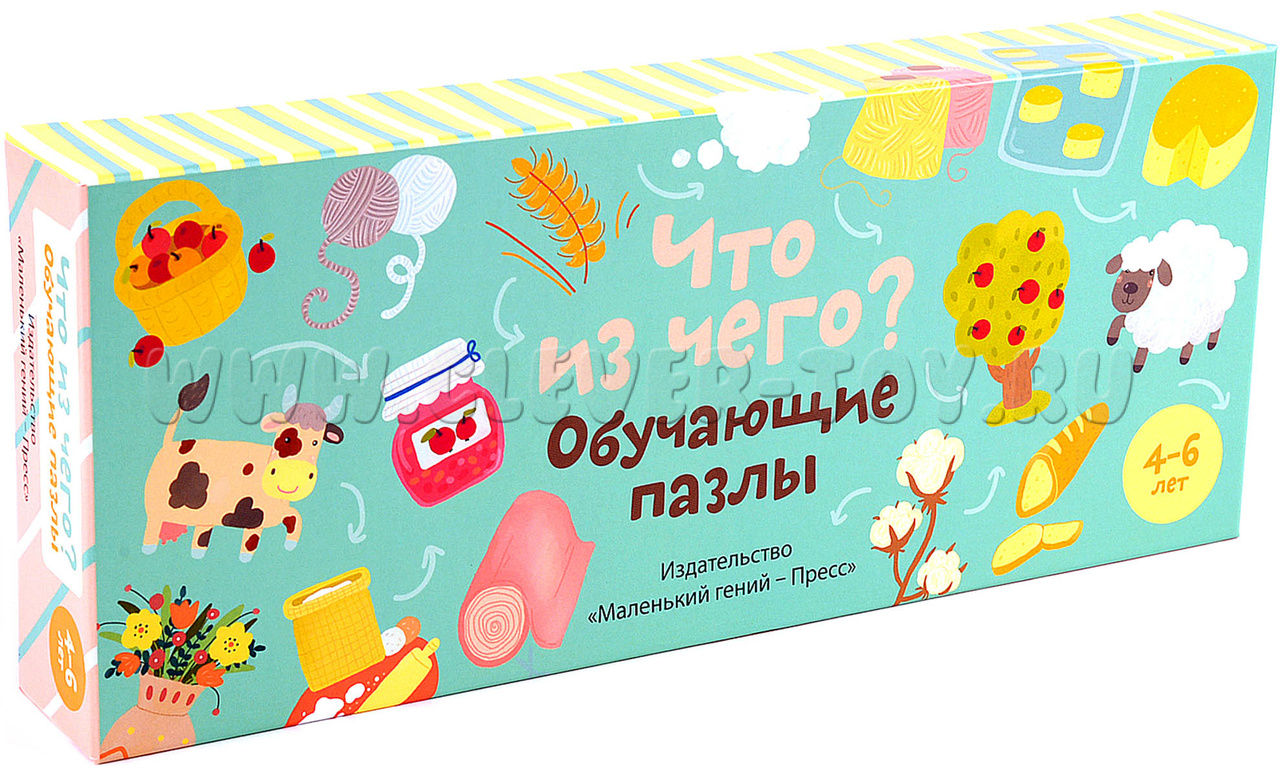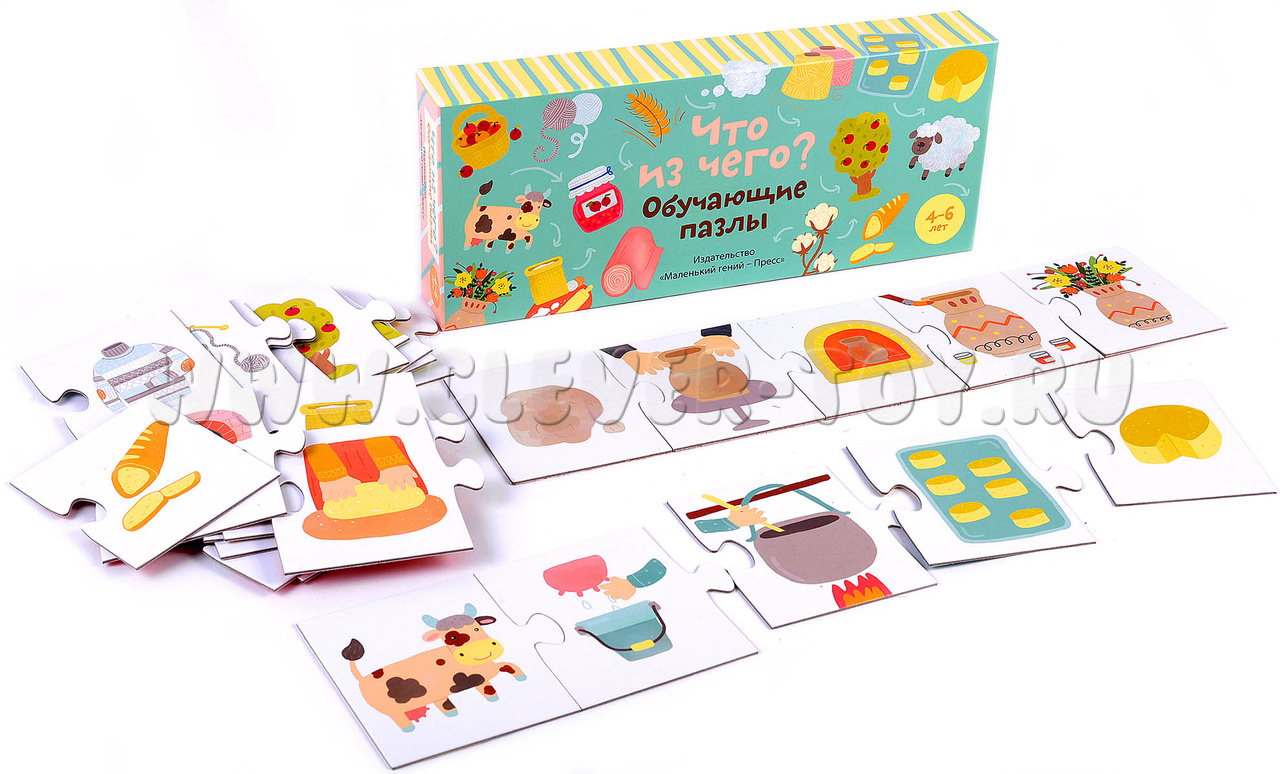 Развивающие пазлы "Что из чего?" подойдут малышам старше 4 лет и ответят на самые часто задаваемые вопросы: откуда это берется? Из чего это сделано? Как, почему? Дети и их родители смогут в легкой игровой форме разобраться, из чего делают хлеб и сыр, как шьют платья, из чего сделана ваза; поговорят о профессиях, материалах и их источниках.