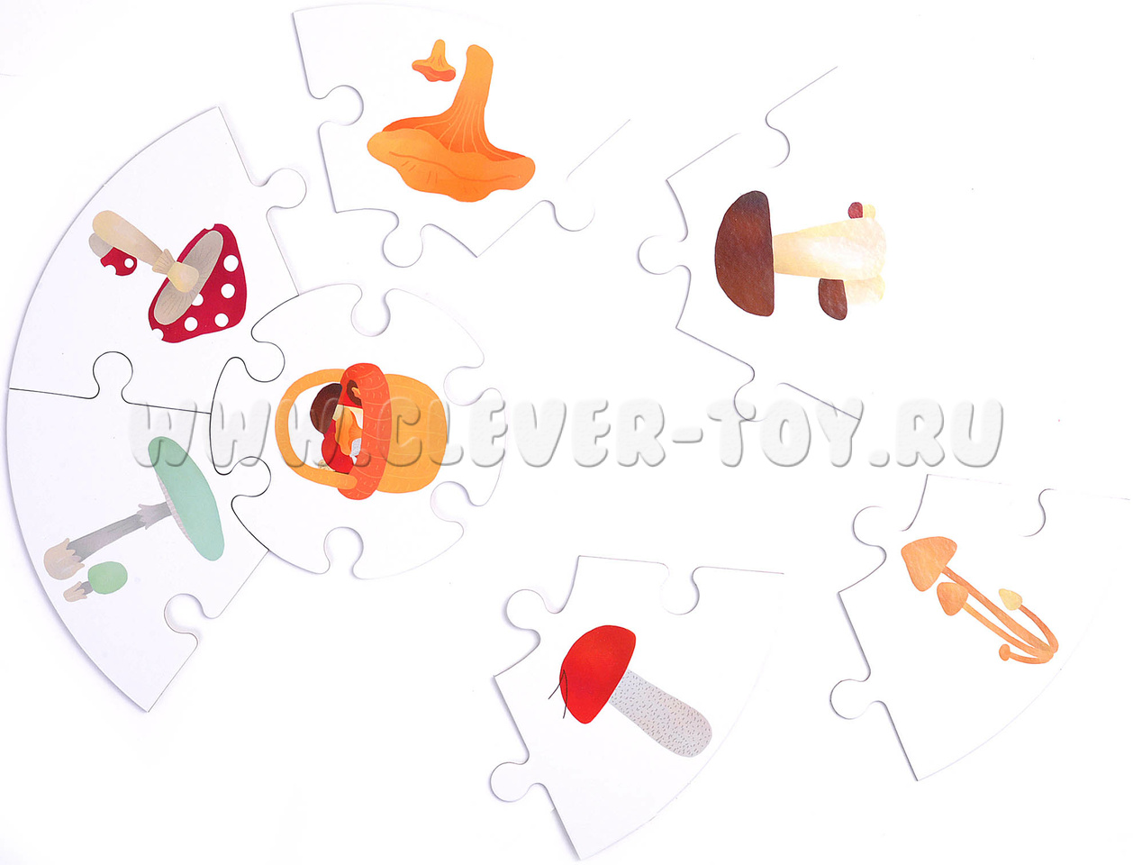 В наборе 6 двухсторонних пазлов по 7 элементов.