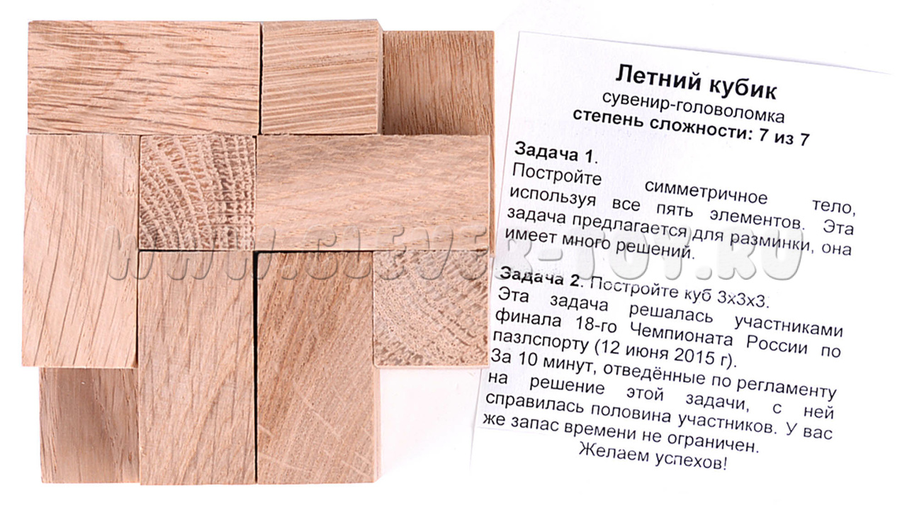 "Летний кубик" – это головоломка, состоящая из пяти элементов различной формы. С виду она кажется простой, однако попробуйте сами решить второе задание.
