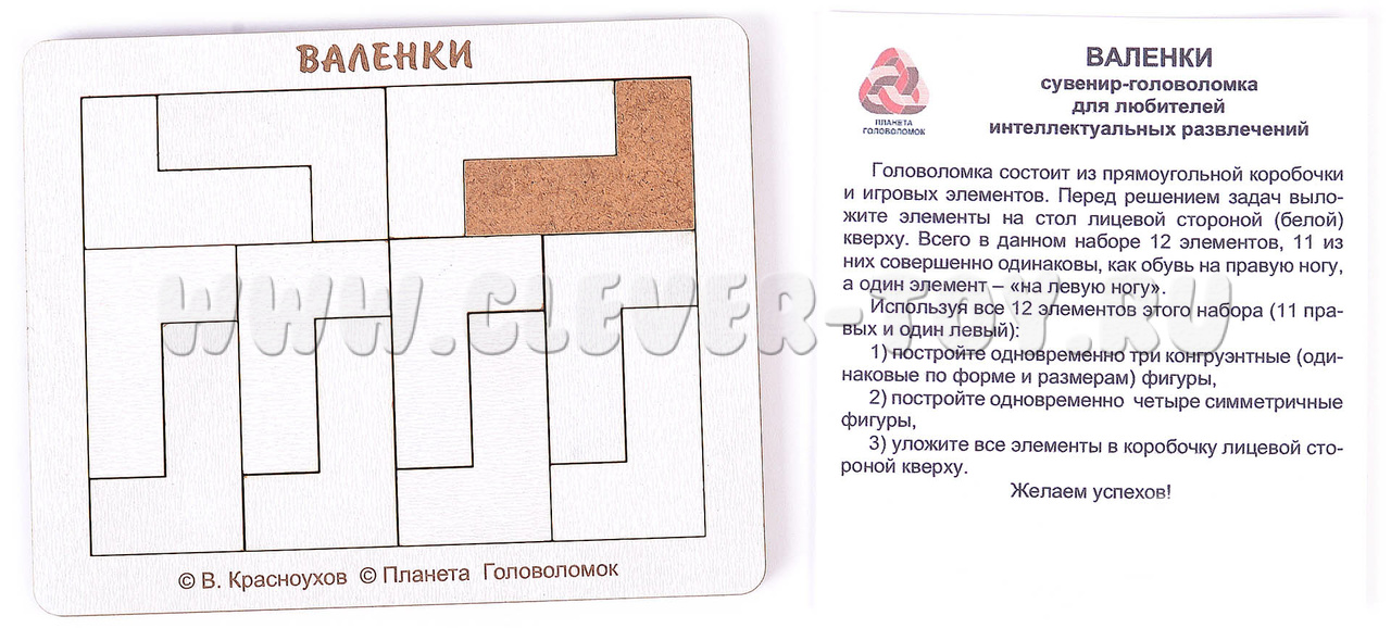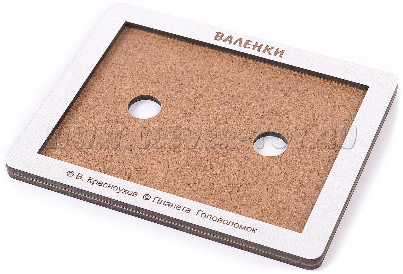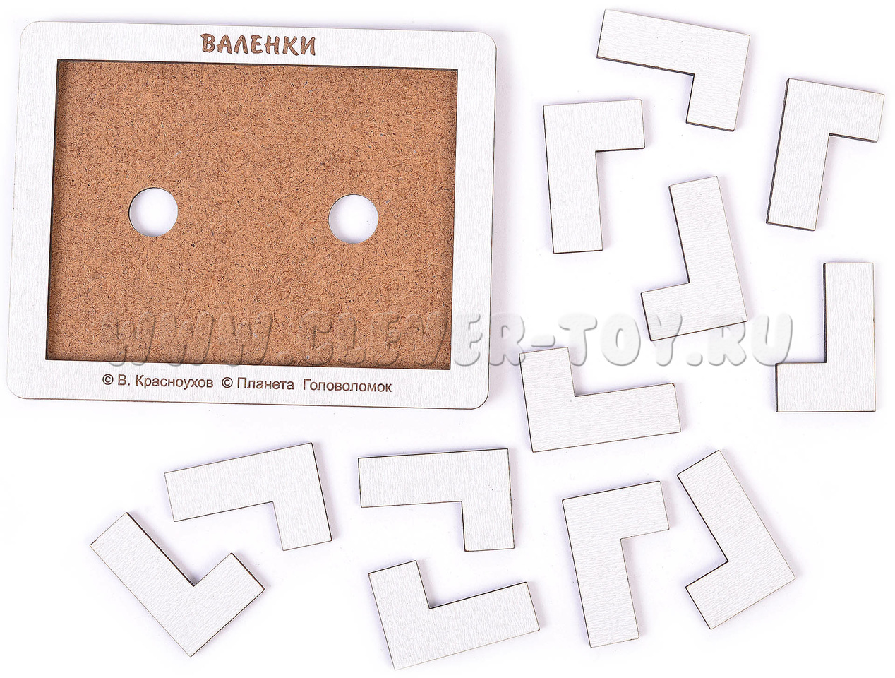 Головоломка "Валенки" состоит из прямоугольной коробочки и игровых элементов.
