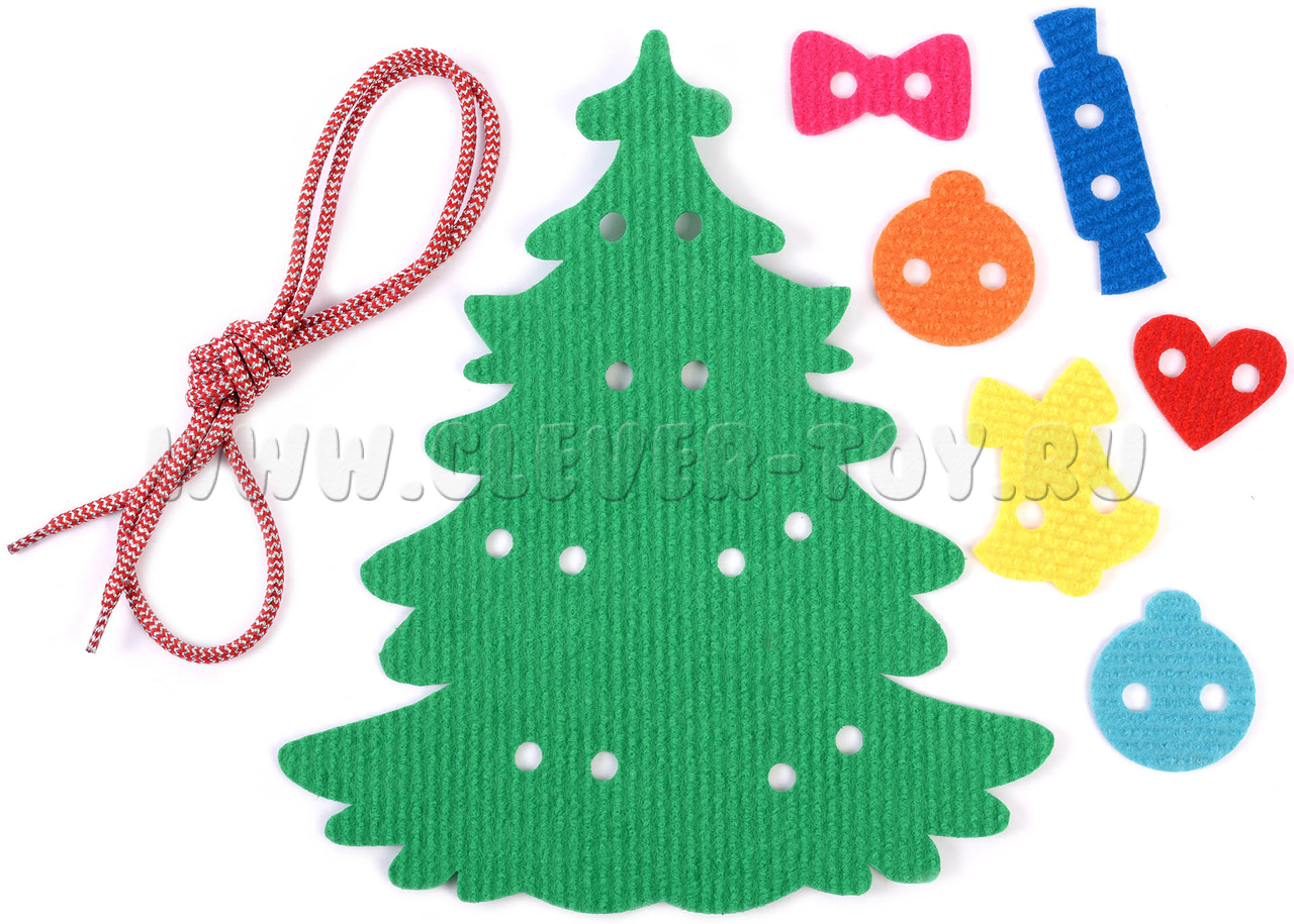 Завязывание шнурков – непростая задача для ребенка. В этом ему поможет елка – конструктор на шнуровке. Регулярные занятия с данным учебным пособием сформируют у малыша терпение, усидчивость и аккуратность, а также дадут представление о формах и цветах.