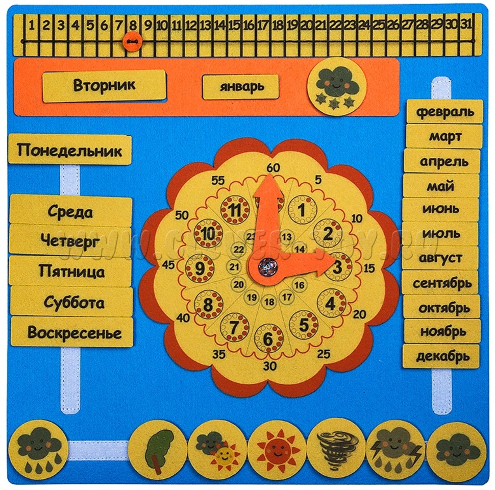 2. Каждый день выставляйте на календаре число и день недели. Наблюдайте погоду на улице и отмечайте ее в календаре с помощью обозначений на кружках.