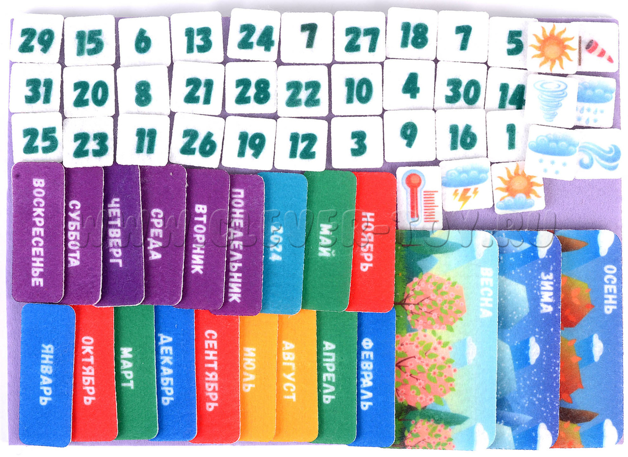 - Таблички, обозначающие времена года (4 шт.), годы (4 шт.), месяца (12 шт.), дни недели (7 шт.), числа (31 шт.), погоду (11 шт.), температуру (2 шт.), время суток (4 шт.).