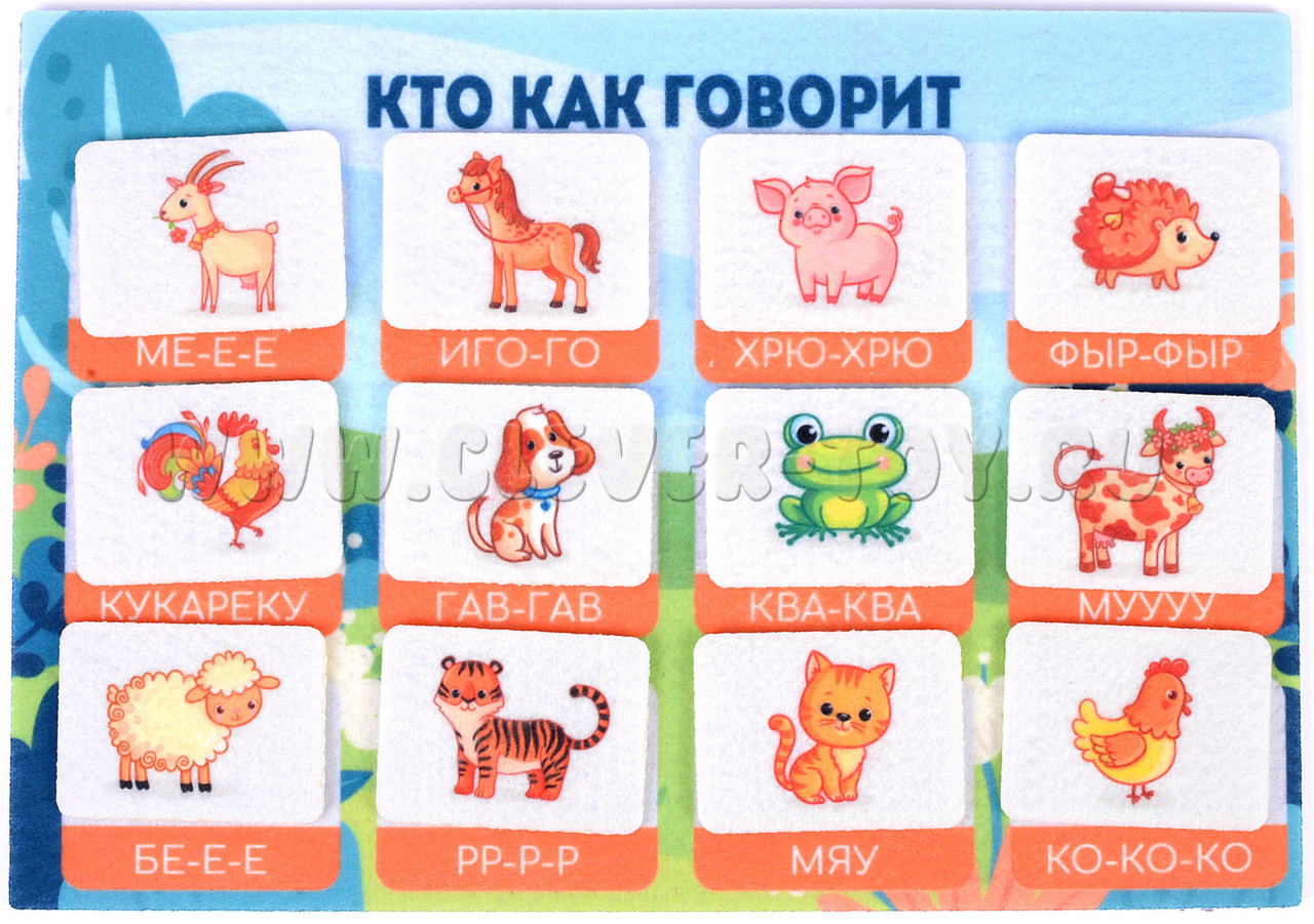 Кто рычит, кто мычит и мяукает? С помощью мягкой аппликации «Кто как говорит» ребенок в игровой форме узнает, какие звуки издают самые разные животные. Регулярно занимаясь с дидактическим пособием, малыш расширит свой кругозор, узнает больше об окружающем мире, а также разовьет свои пальчики и мышление.