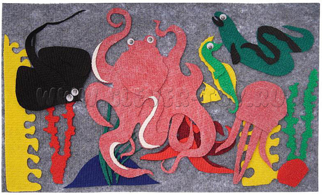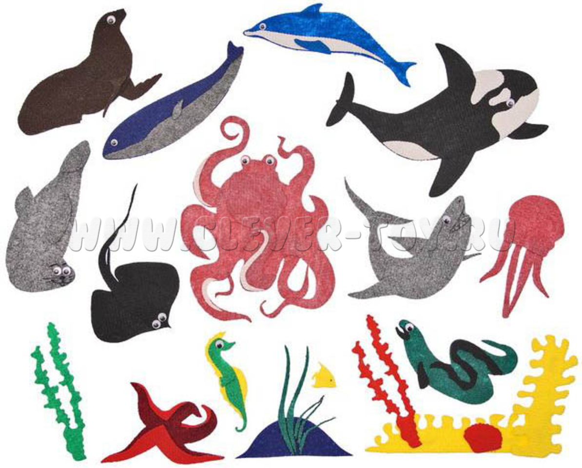- обитатели моря: осьминог, касатка, морской котик, тюлень, кит, акула, скат, медуза, морской конёк, дельфин, мурена, морская звезда, рыбка;