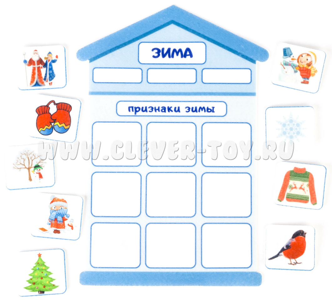 - маленькие фигурки на липучках с изоброжением деревьев, мальчиков, девочек, птиц, ягод, солнца, снежинки и т.д..