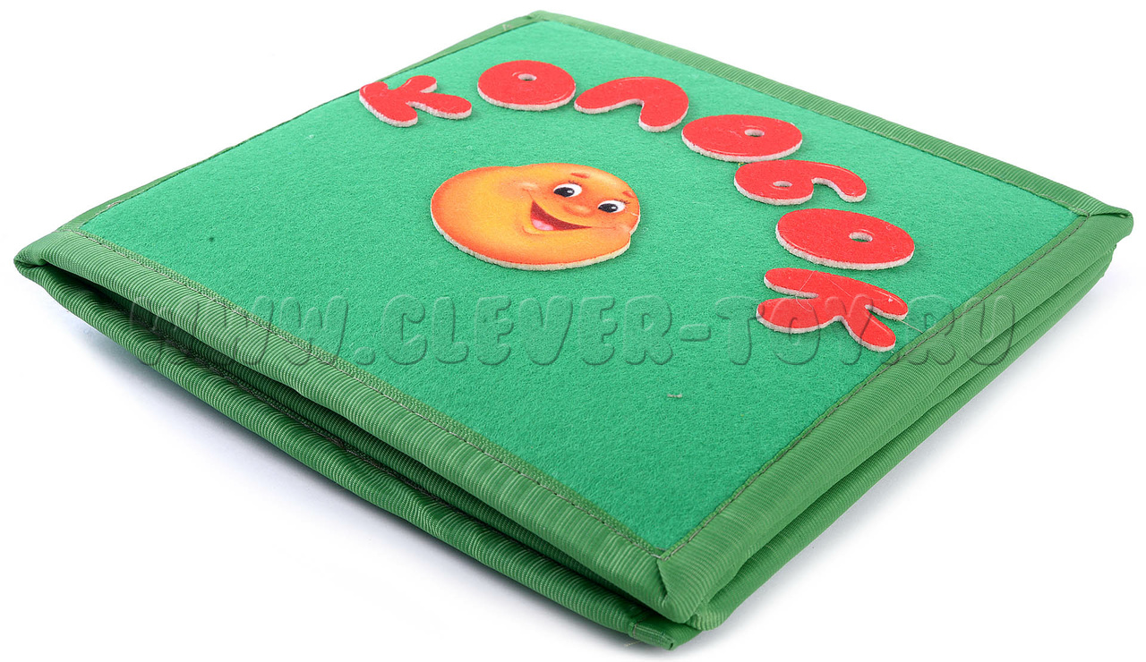 Все фигуры на липучках выполнены из ковролина. Это качественный современный материал. По составу является более плотным, чем известный фетр, поэтому он совсем не мнется, не рвется во время игры, хорошо и надолго сохраняя форму игровых элементов. Яркие фигуры любимых героев сказки «Колобок» - интересные, разнообразные, абсолютно безопасные.