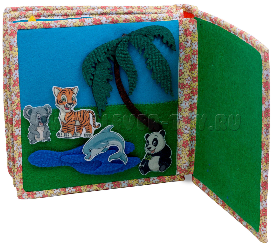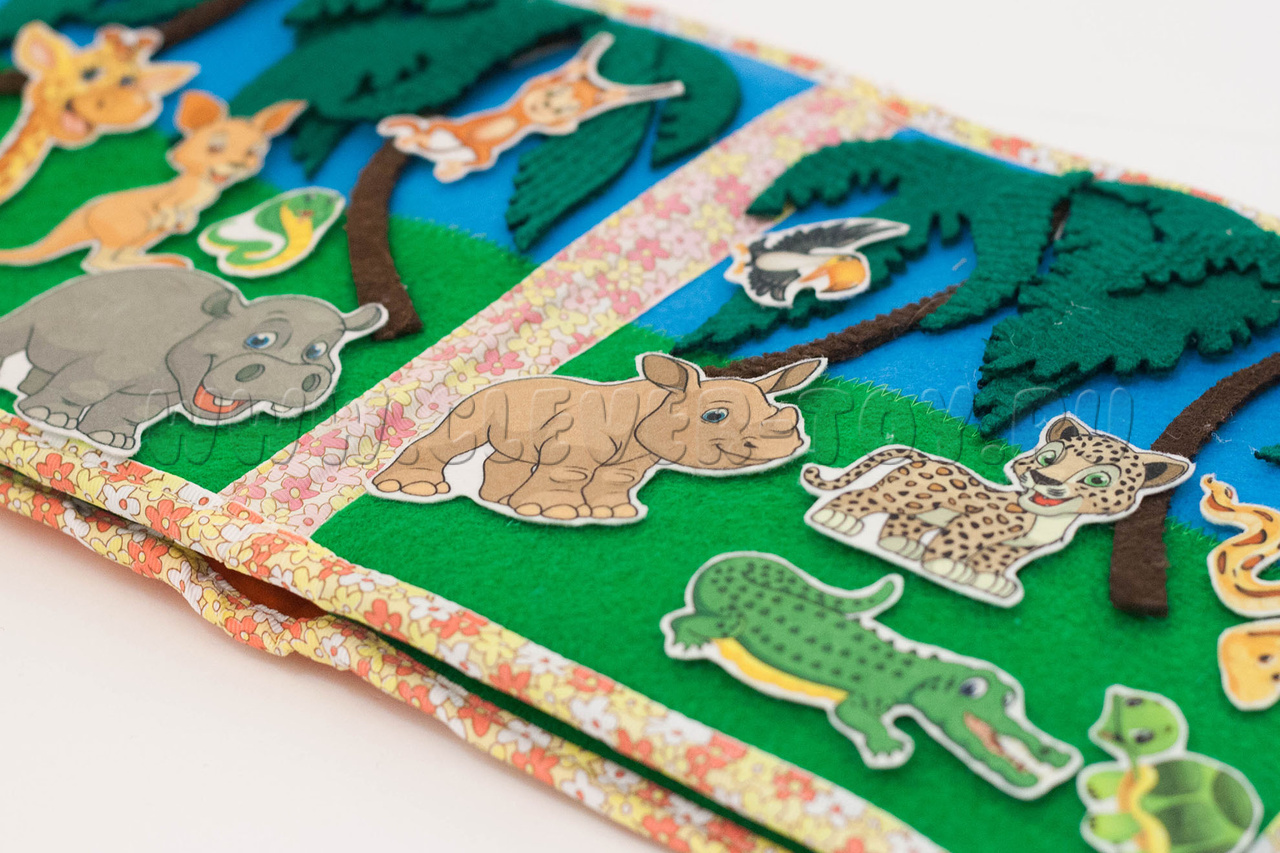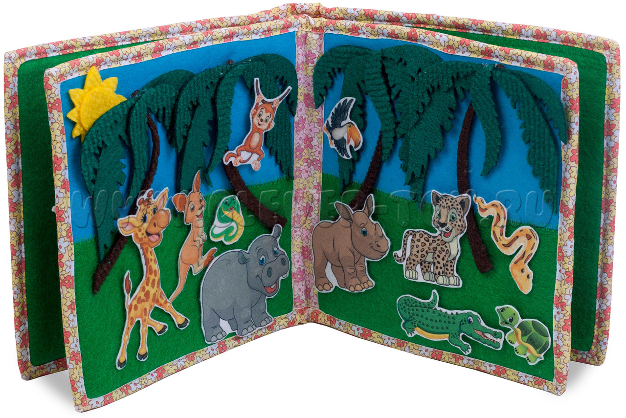 Авторская развивающая книга "Животные жарких стран" из ковролина с фигурами на липучках от российской компании "Лип-Лип".