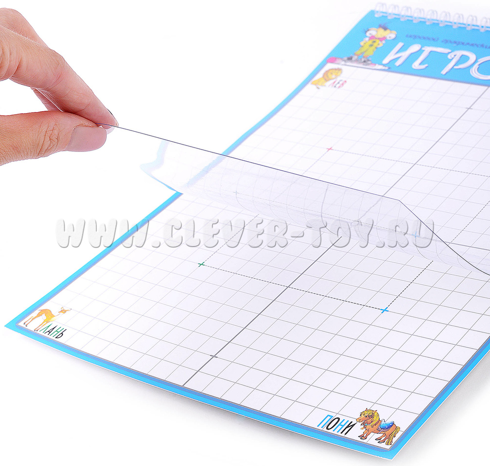 Ребёнок вкладывает лист игрового задания в папку под прозрачный экран и выполняет задания маркером. Лёгкое удаление изображения с помощью салфетки позволяет многократно использовать листы игровых заданий.