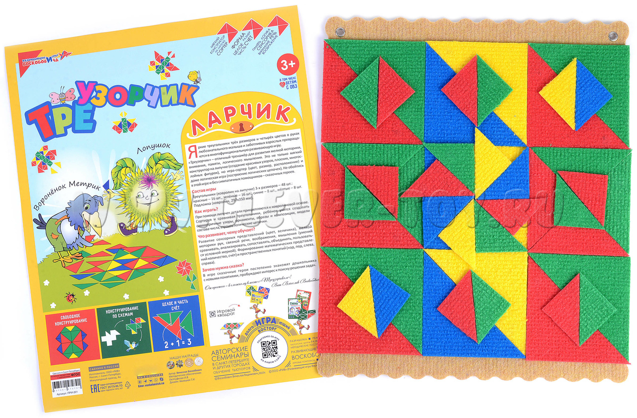 Состав игры: Треугольники 3-х размеров - 48 штук (красные- 16 шт., зелёные - 16 шт., синие - 8 шт., жёлтые - 8 шт.) Подложка (ковролин 29,7 х 35 см.) с двумя люверсами по верхним углам.