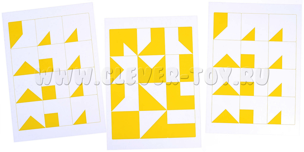 • 3 прозрачные пластинки, на каждой располагается 12 квадратов с разными выделенными цветом (жёлтым) частями, всего 36 квадратов;