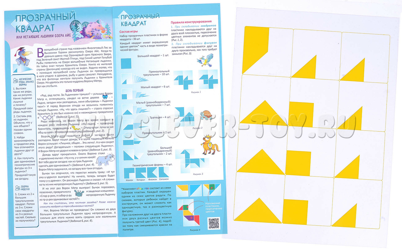 Жёлтый Прозрачный квадрат от фирмы «Развивающие игры Воскобовича» - один из серии «Прозрачных квадратов» разных цветов (синий, зелёный, красный). Пособия можно использовать по отдельности, а также комбинировать все 4 цвета квадратов, смешивая цвета и получая новые сочетания: оранжевый, фиолетовый, коричневый и т.д.