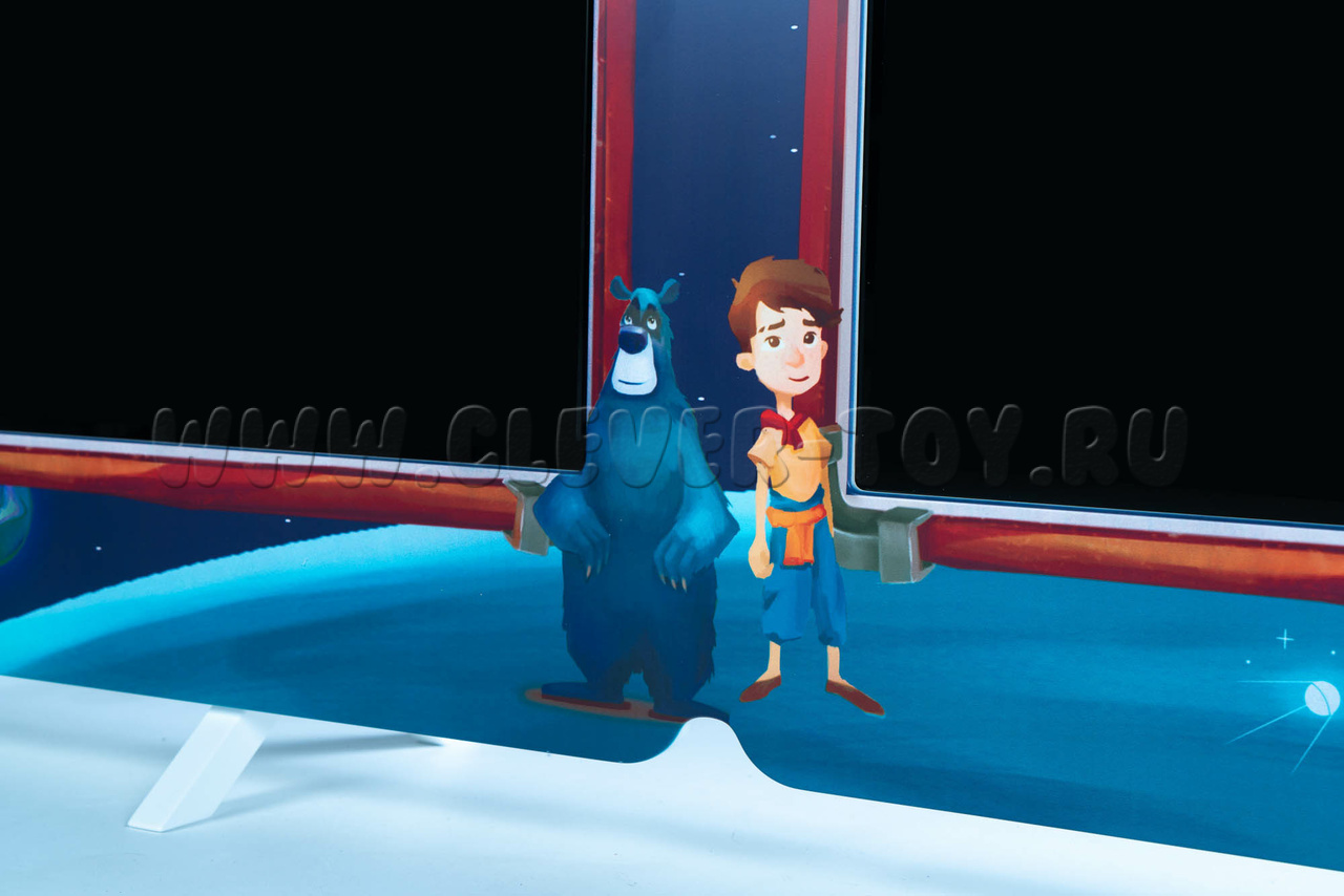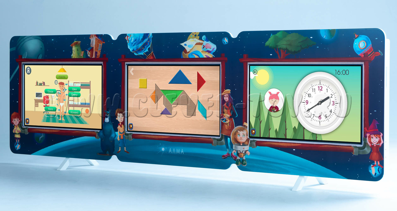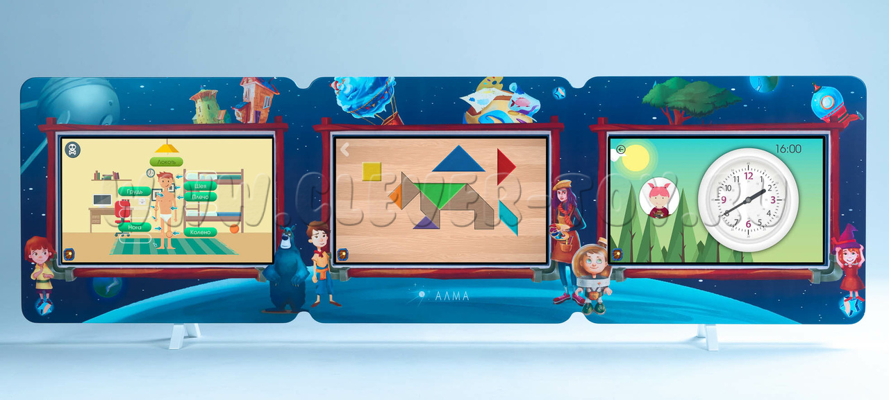 1. ТРИ интерактивных настенных панели по 25 дюймов в одном корпусе, украшенным детскими картинками и персонажами из программного обеспечения (Full HD, мультитач 10 касаний, intel, 4 гб RAM, SSD 120 гб, win 10);