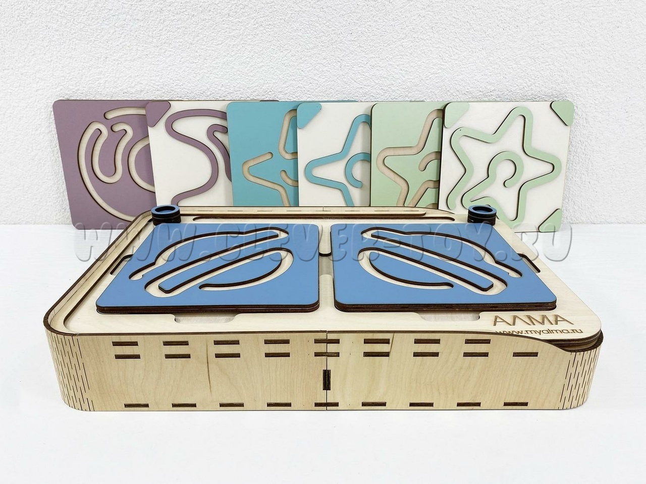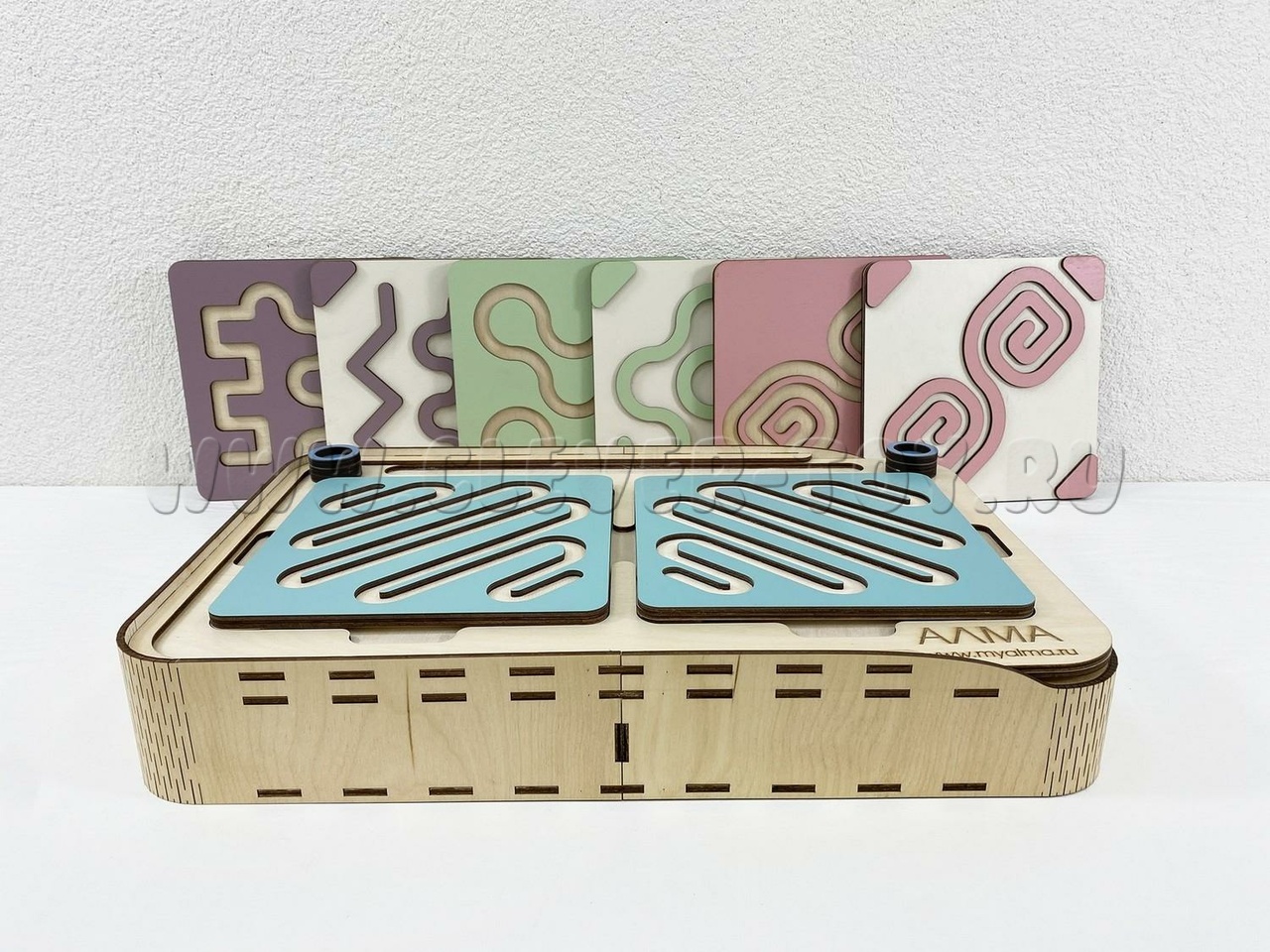 Два лабиринта с изображениями, расположенными симметрично, помещаются в пазы, и ребёнок проходит их с помощью специальных пальчиковых фишек. Такие занятия способствуют развитию мелкой моторики, внимательности и логического мышления.