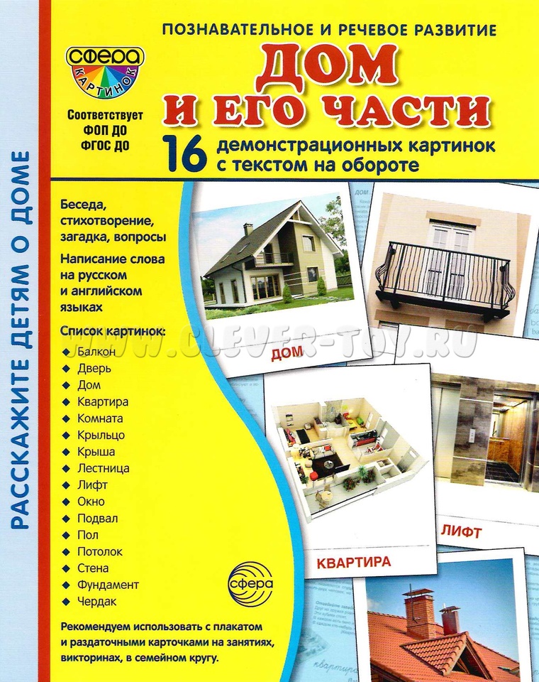 16 демонстрационных картинок для познавательного и речевого развития. На обороте каждой предметной картинки - описание дома и его частей, стихотворение, загадка, вопросы для ребёнка, название животного на русском и английском языках.