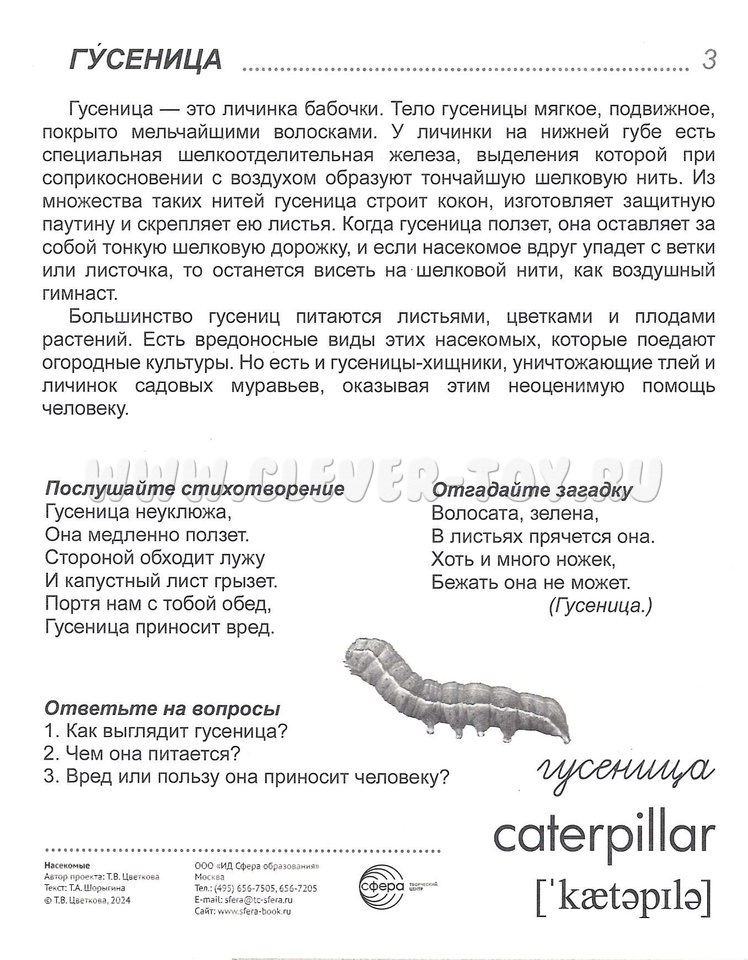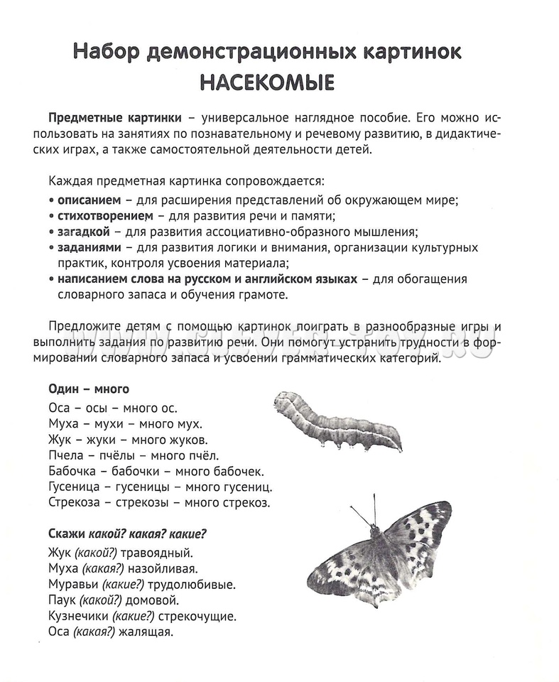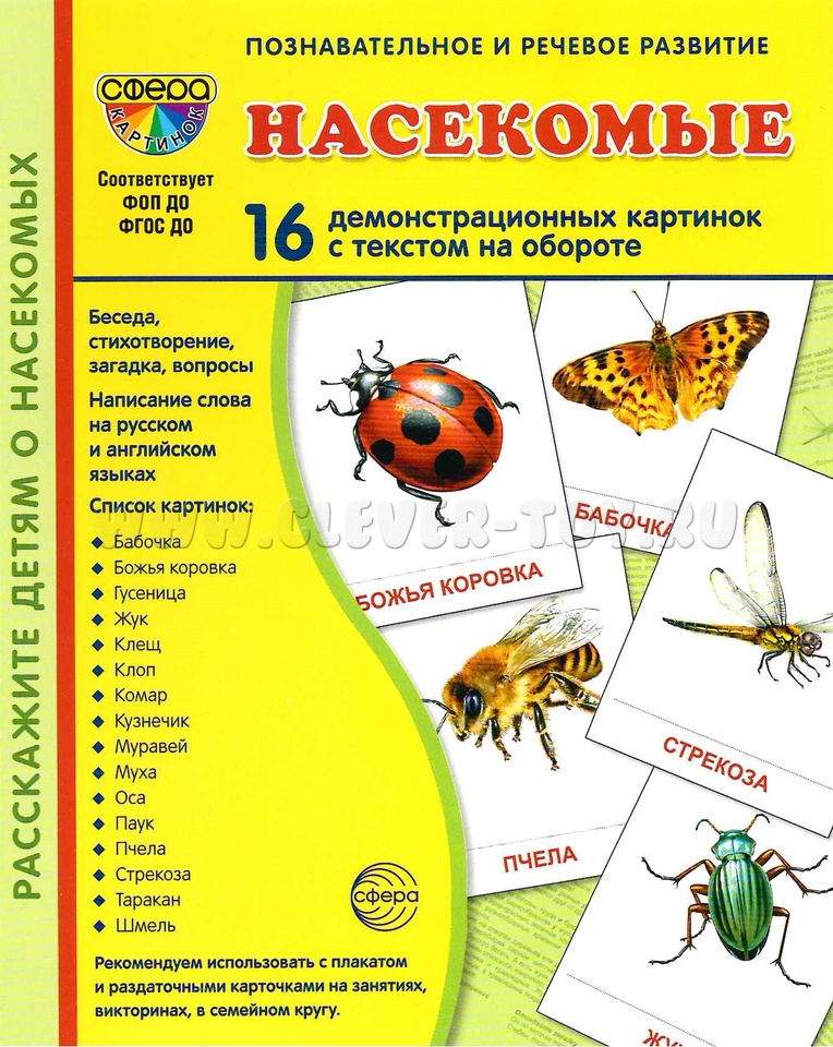 На лицевой стороне каждой картинки дается цветное изображение насекомого - краткое описание, стихотворение, загадка и вопросы по теме. Название каждого насекомого имеет перевод на английский язык и соответствующую транскрипцию. Материал излагается доступным для ребенка языком и целиком раскрывает тему.