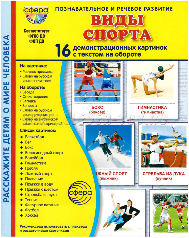 Список картинок: Баскетбол, Бег, Бокс, Велосипедный спорт, Волейбол, Гимнастика, Гребля, Лыжный спорт, Плавание, Прыжки в воду, Прыжки с шестом, Стрельба из лука, Теннис, Фигурное катание, Футбол, Хоккей.