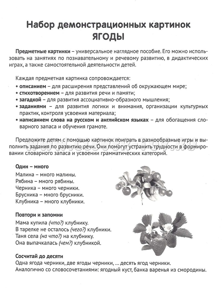 Комплект "Ягоды" состоит из 16 цветных демонстрационных карточек (картинок) и адресован детям и их родителям, желающим познакомиться с полезными ягодами, растущими на территории нашей страны.