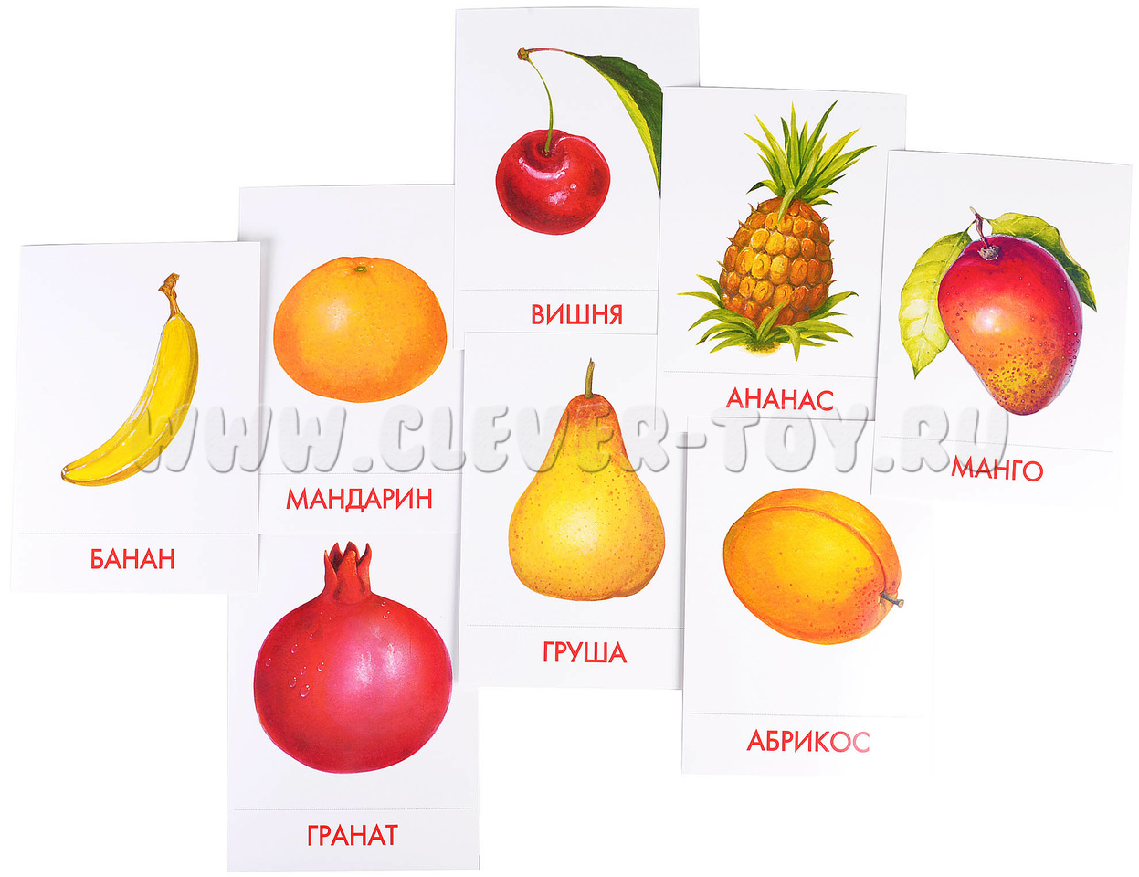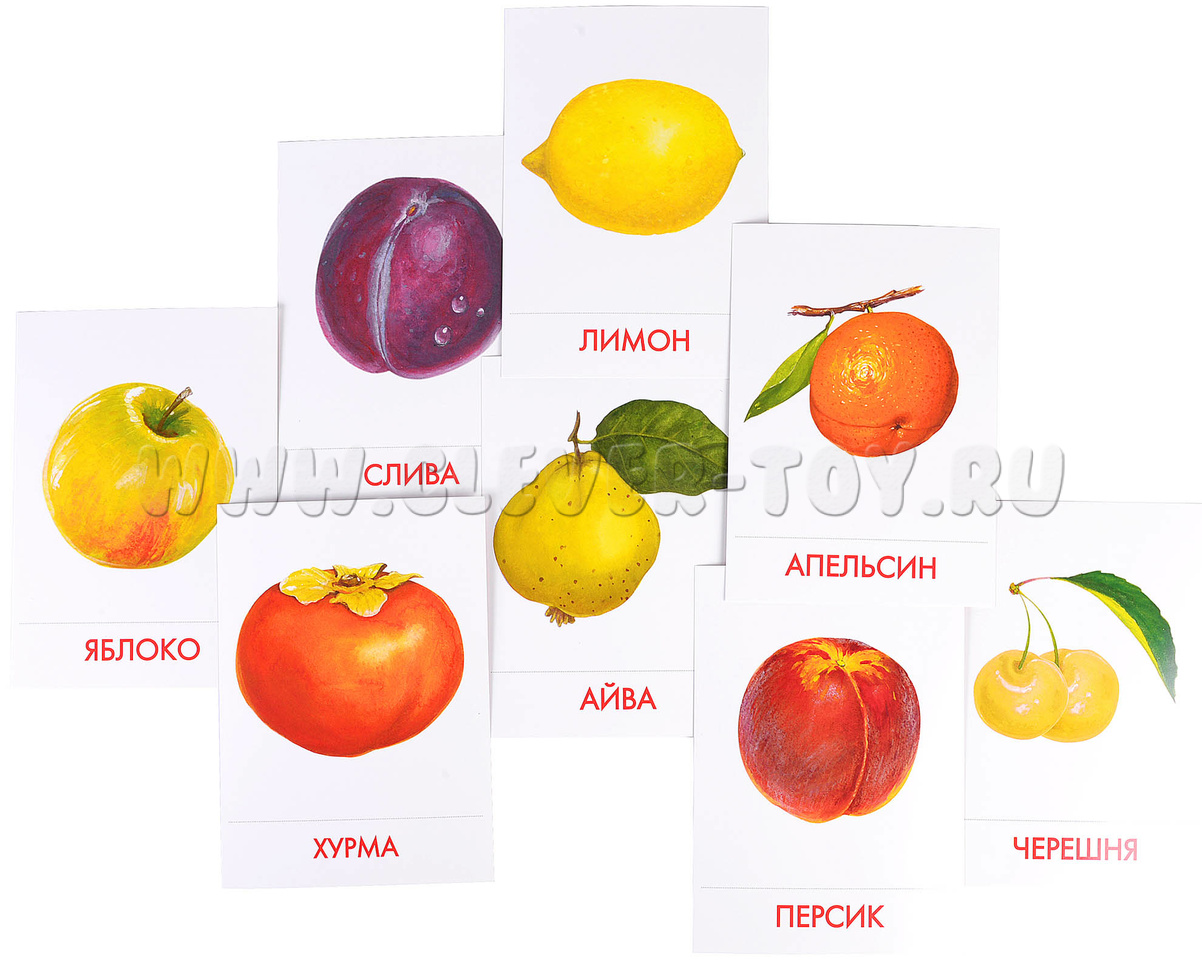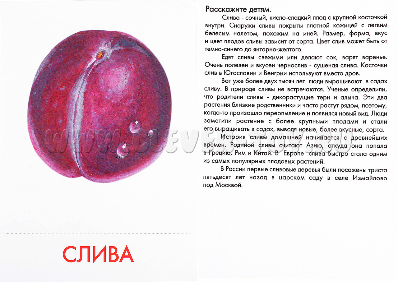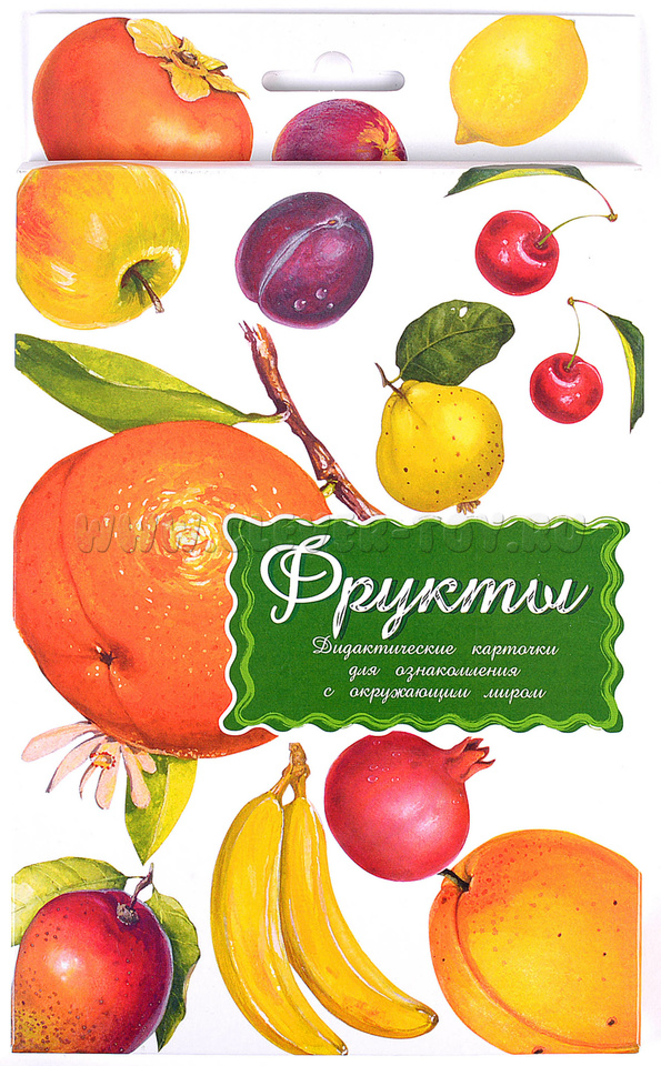 На одной стороне карточки расположена яркая картинка с изображением и названием фрукта, на обратной стороне – доступная и интересная для ребёнка информация о фруктах (описывает внешний вид фрукта, область произрастания, интересные факты о применении фруктов).