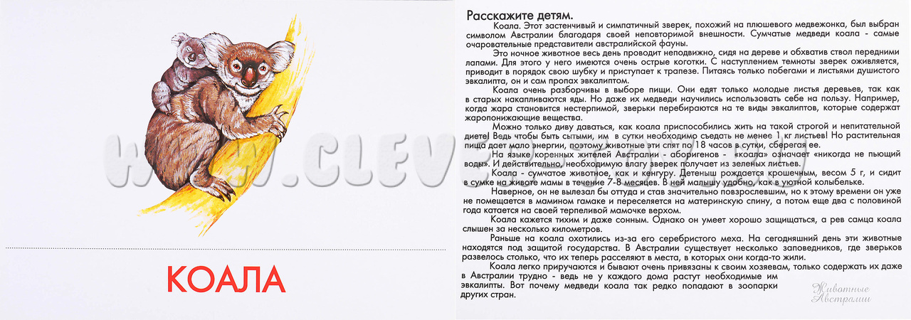 На одной стороне карточки расположена яркая картинка с изображением и названием животного Австралии (изображение детальное и реалистичное), на обратной стороне – доступная для ребёнка информация животных и птицах (описывает внешний вид животного, ареал обитания, особенности питания и строения, интересные факты о происхождении животных Австралии). Карточки выполнены из прочного картона, подходят для многократного использования. За одно занятие рекомендуется изучать одну карточку.