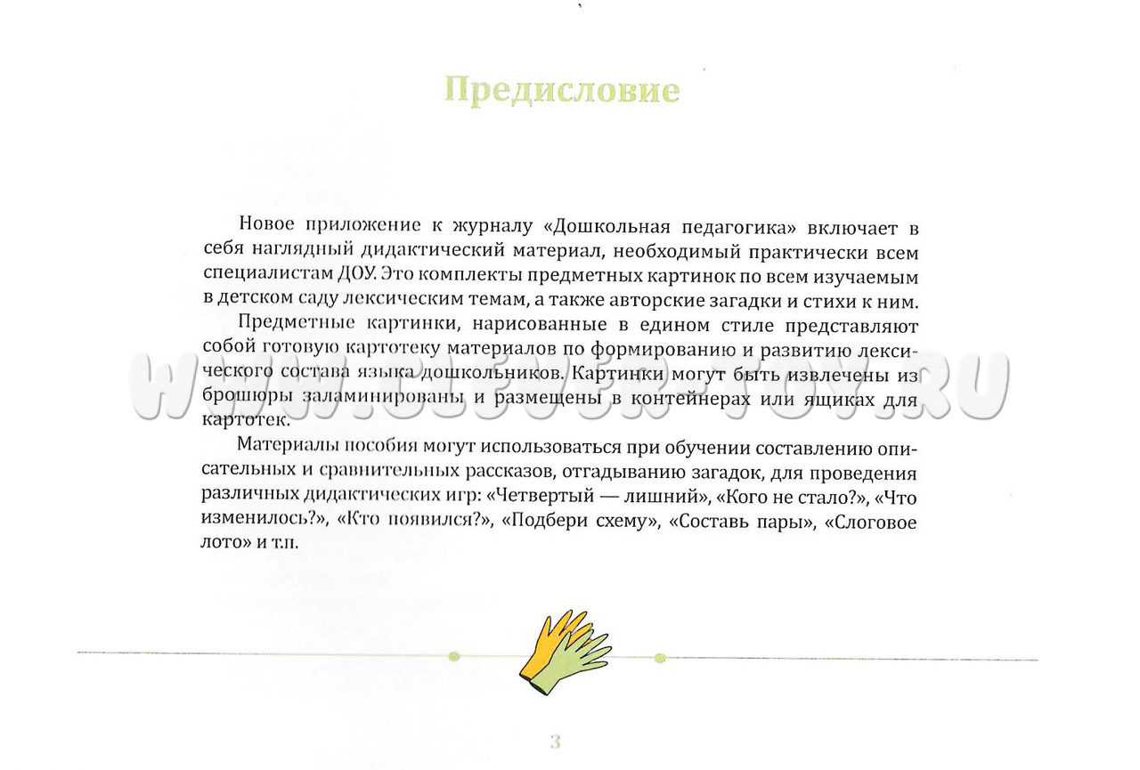 Предметные картинки, нарисованные в едином стиле представляют собой готовую картотеку материалов по формированию и развитию лексического состава языка дошкольников. Картинки могут быть извлечены из брошюры заламинированы и размещены в контейнерах или ящиках для картотек.