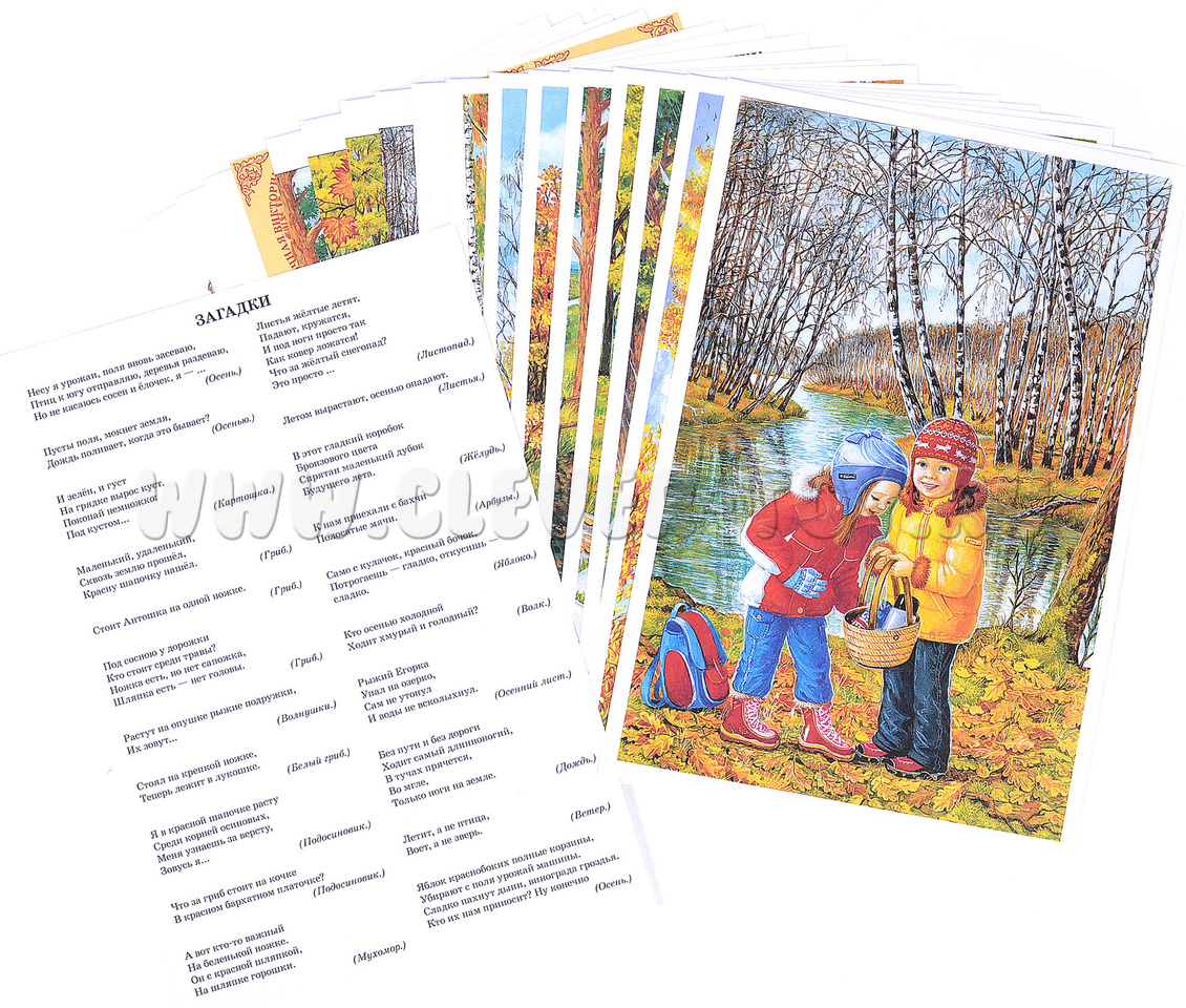 - 10 красочных изображений, иллюстрирующих изменение погоды, явления природы, виды деятельности, на обороте - список признаков осени, пословицы и приметы, загадки, планы развивающих и подвижных игр;
