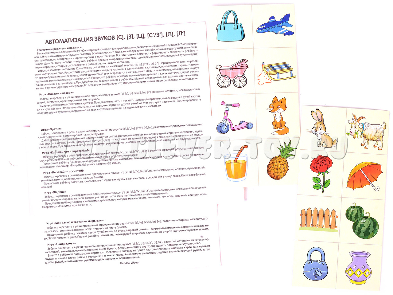 Учебно-игровой комплект "Автоматизация звуков [С], [З], [Ц], [С'/З'], [Л], [Л']" представляет собой 12 листов, состоящих из 96 картинок и 7 нейроигр, предназначен для детей 5-7 лет.