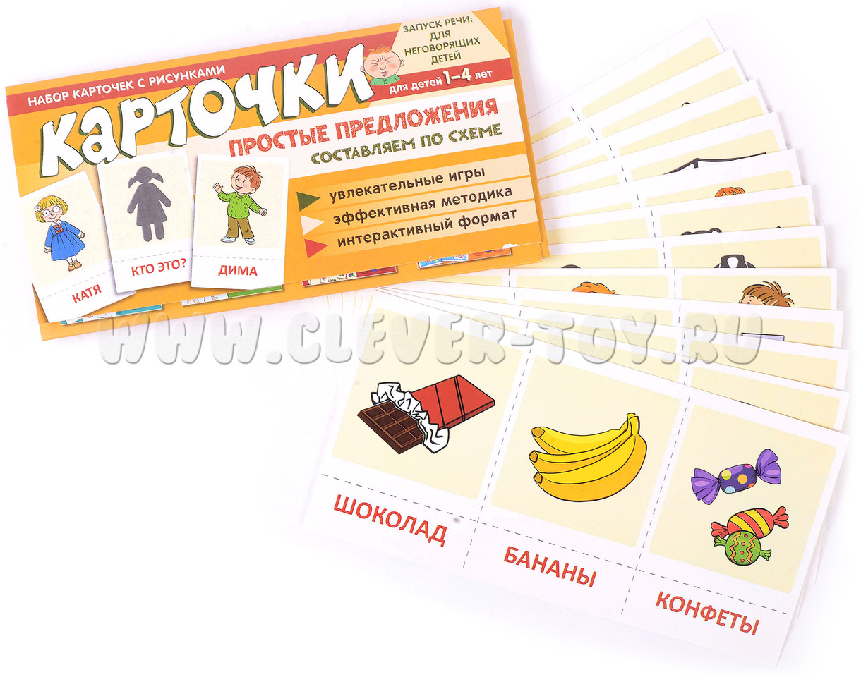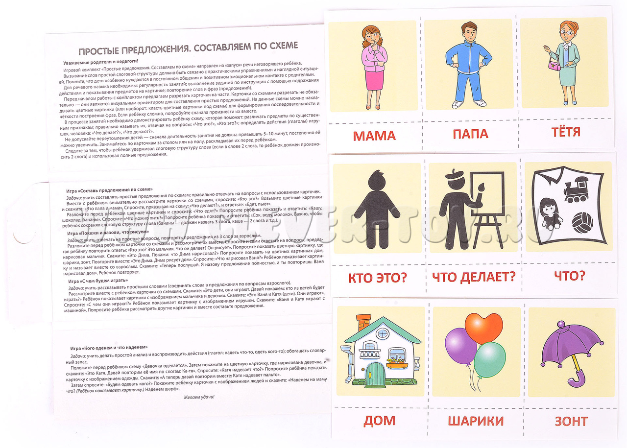 Задания в наборе представлены в игровой форме и помогают стимулировать речь у неговорящих детей, делая первые шаги к составлению простых предложений по схеме.