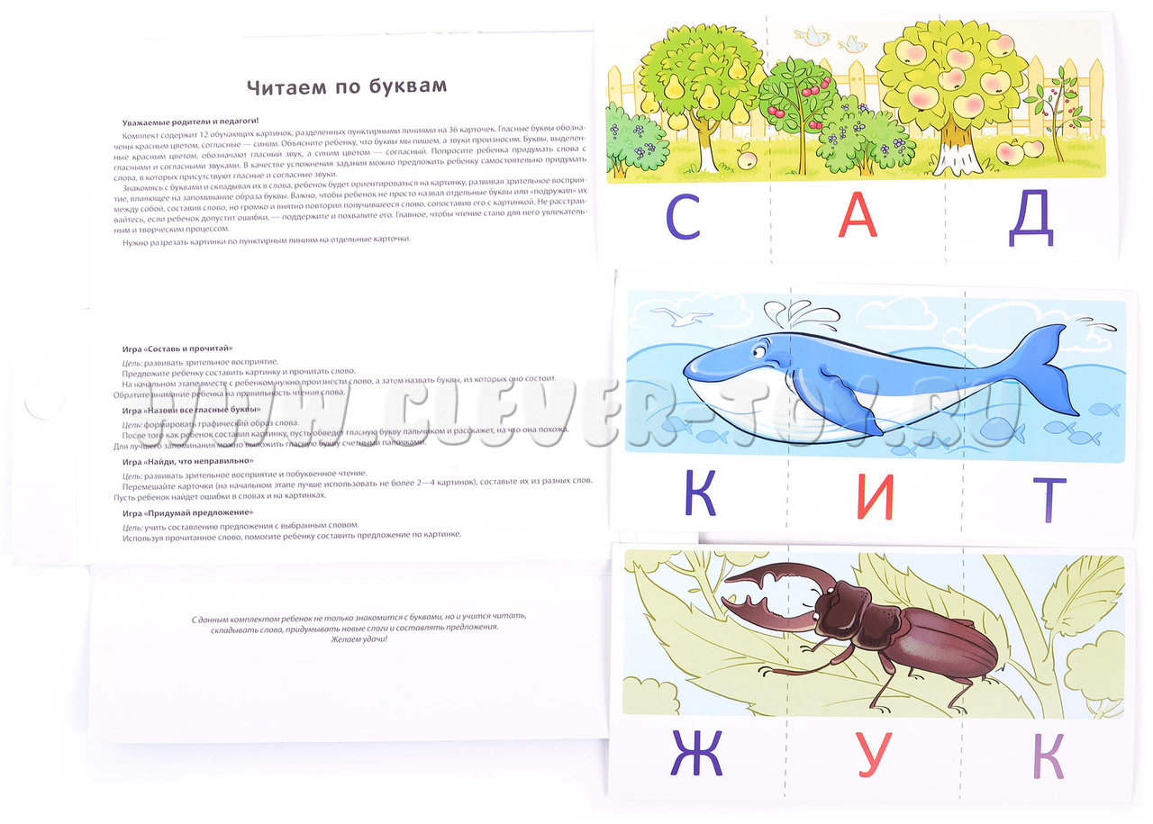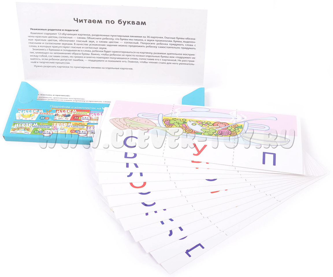 Издание, предназначенное для обучения детей 4-7 лет чтению, представляет собой комплект из 12 обучающих картинок, включающих 36 карточек и 12 слов.
