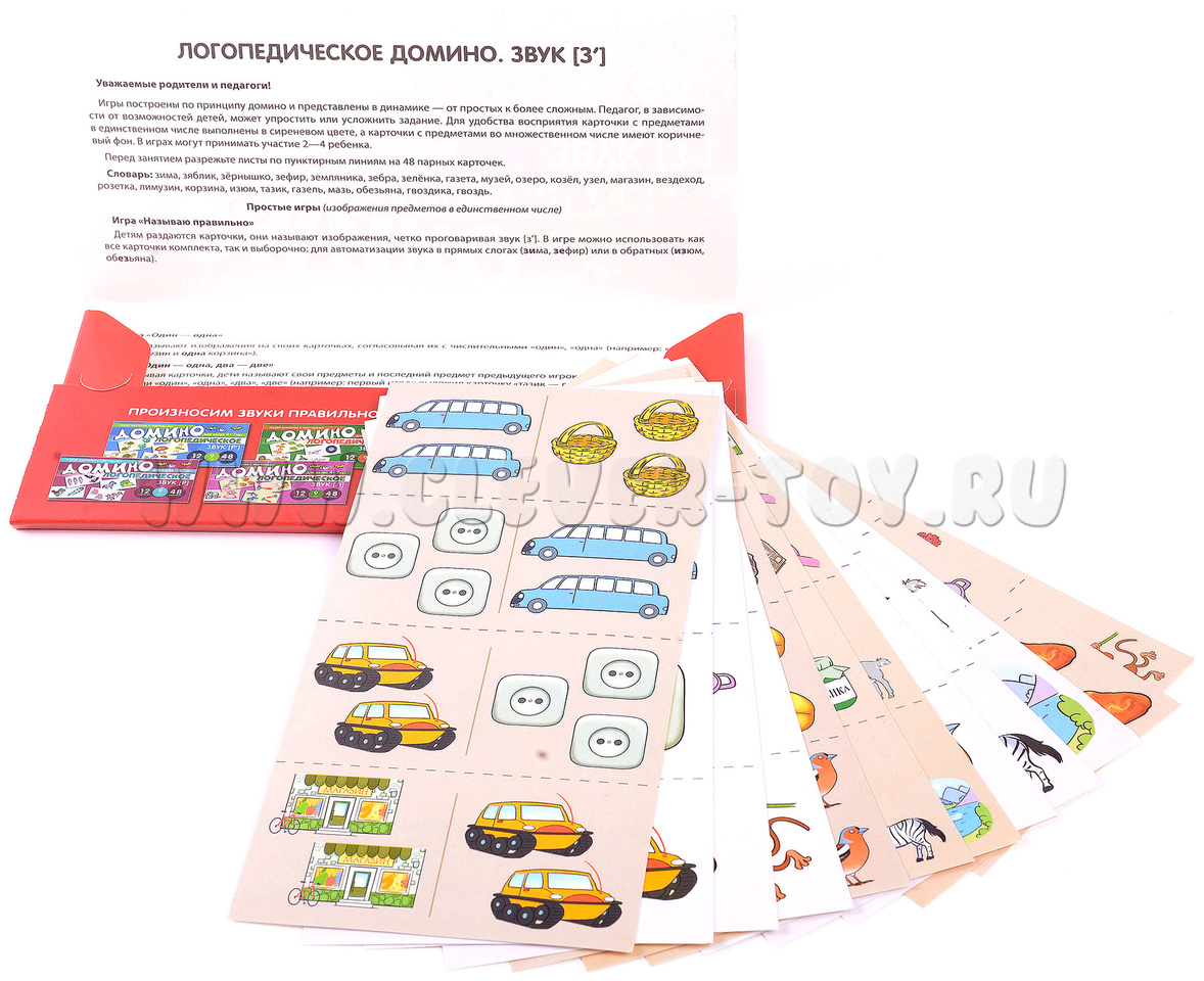 "Логопедическое домино" - это учебно-игровой комплект, состоящий из 12 обучающих карточек с 48 парами цветных картинок. В процессе игры ребёнок научится правильно произносить звук [з’], а также образовывать форму множественного числа существительных и согласовывать их с числительными и прилагательными.