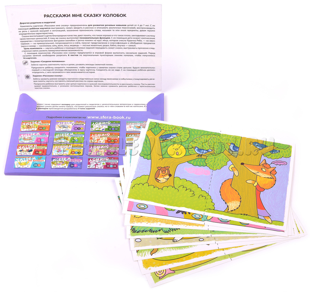 Комплект карточек "Расскажи мне сказку. Колобок" - это увлекательное игровое пособие, созданное для детей младшего школьного возраста. Он включает в себя восемь разрезных листов и вкладку с интересными заданиями и вопросами, которые будут полезны как родителям, так и педагогам.