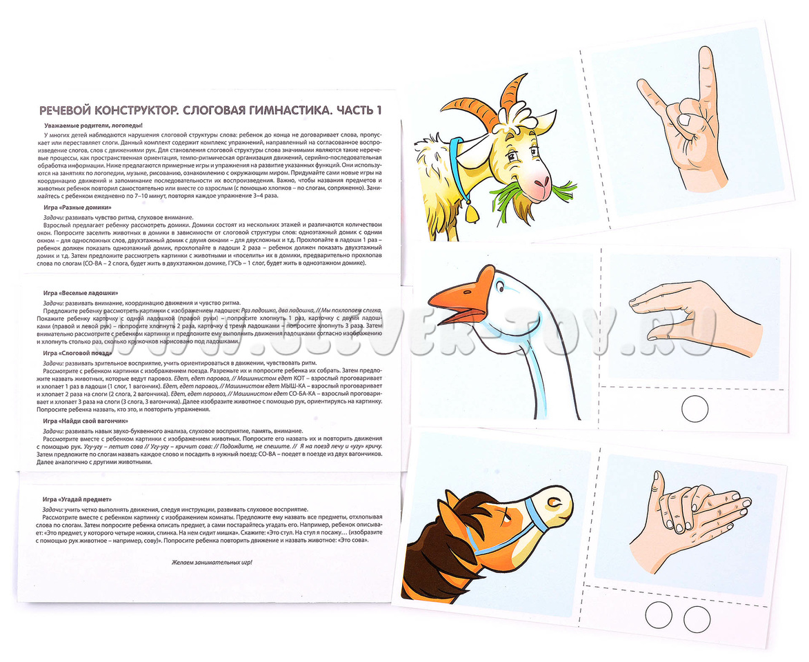 С помощью этого набора ваш ребёнок сможет одновременно произносить звуки, слоги и слова, а также выполнять цепочки движений. Это поможет ему развить пространственные навыки, улучшить моторные функции, а также развить зрительное восприятие и слухомоторную память.