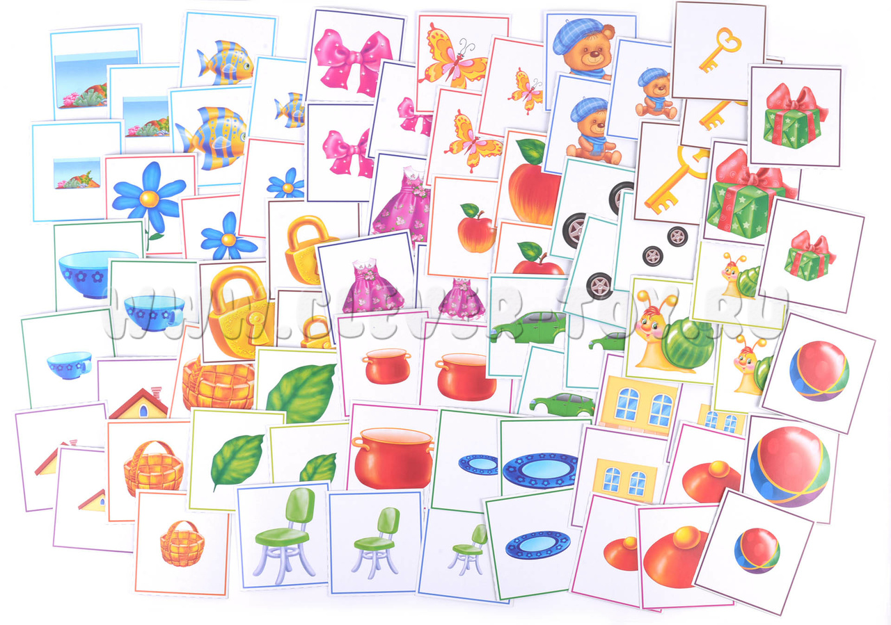 Перед началом игры нужно разрезать карты по пунктирным линиям (получится 72 карточки). Карточки подбираются по цветам и размерам изображений.