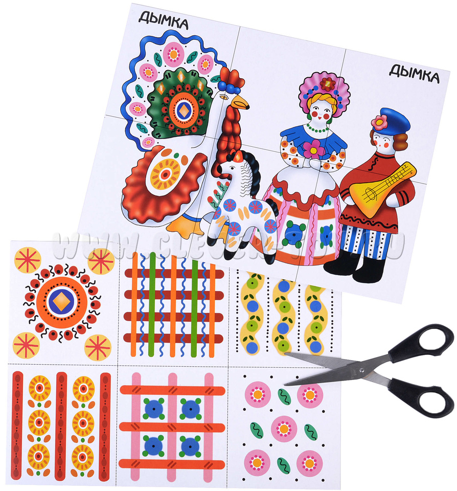 Количество: 6 больших карт с узорами народных промыслов (по 1 на каждый, карты подписаны, нанесена разметка); 6 разрезных карт с узорами (по 1 на каждый промысел, по 6 узоров на каждой карте, всего 36 карточек)