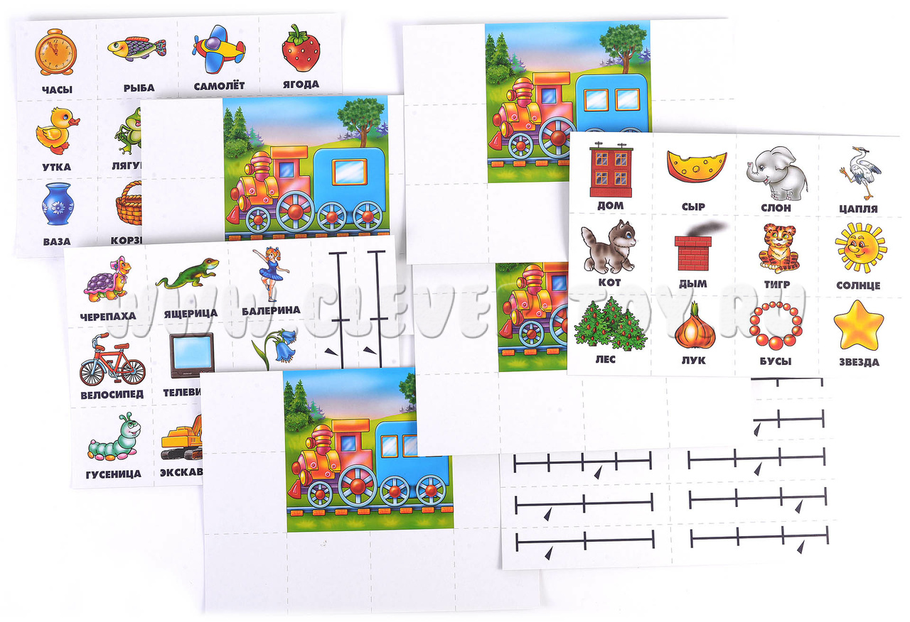 2. Раскладываем карточки со словами на больших картах по вагончикам (например, если вагончик с 3 окошками - слова из 3 слогов).