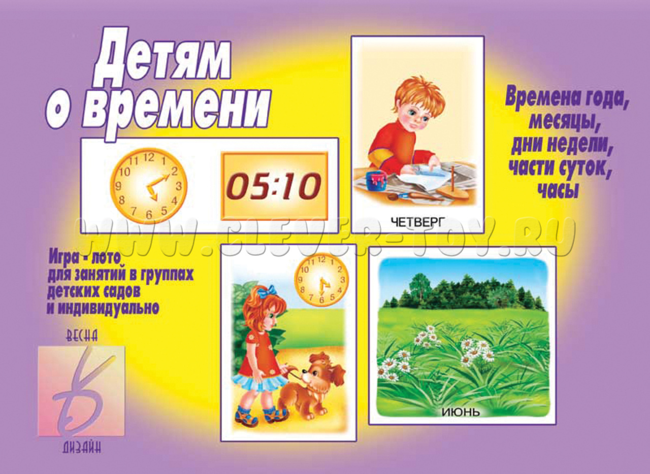 Развивающая игра-лото для детей 5-7 лет, знакомящая с временными понятиями (времена года, мясяцы, дни недели, части суток, часы). Перед началом игры требуется разрезать карты по пунктирным линиям.
