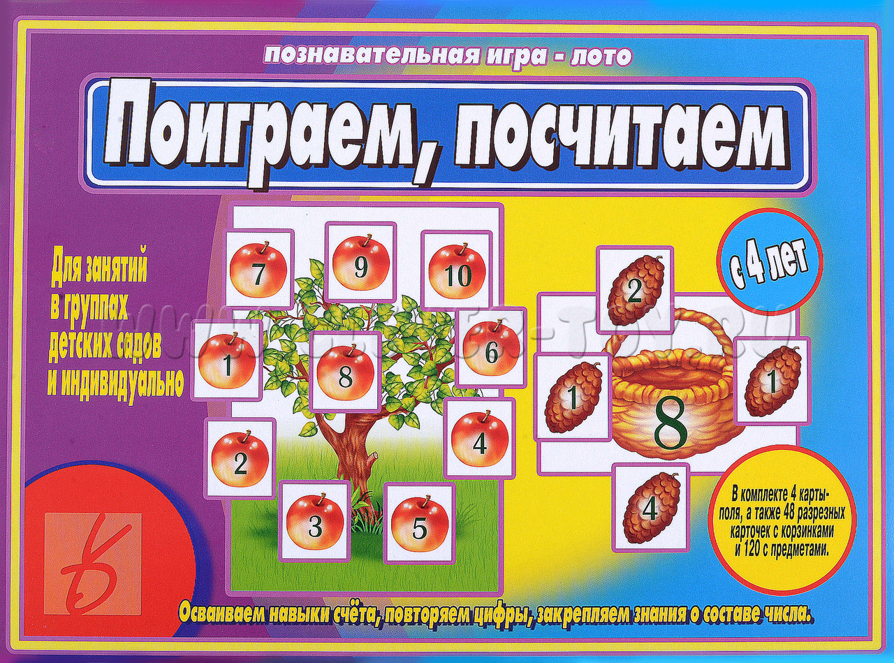 Познавательная игра-лото "Поиграем, поситаем" предназначена для детей с 4-х лет. Данная игра поможет детям освоить навыки счета, повторить цифры, закрепить знания о составе числа.