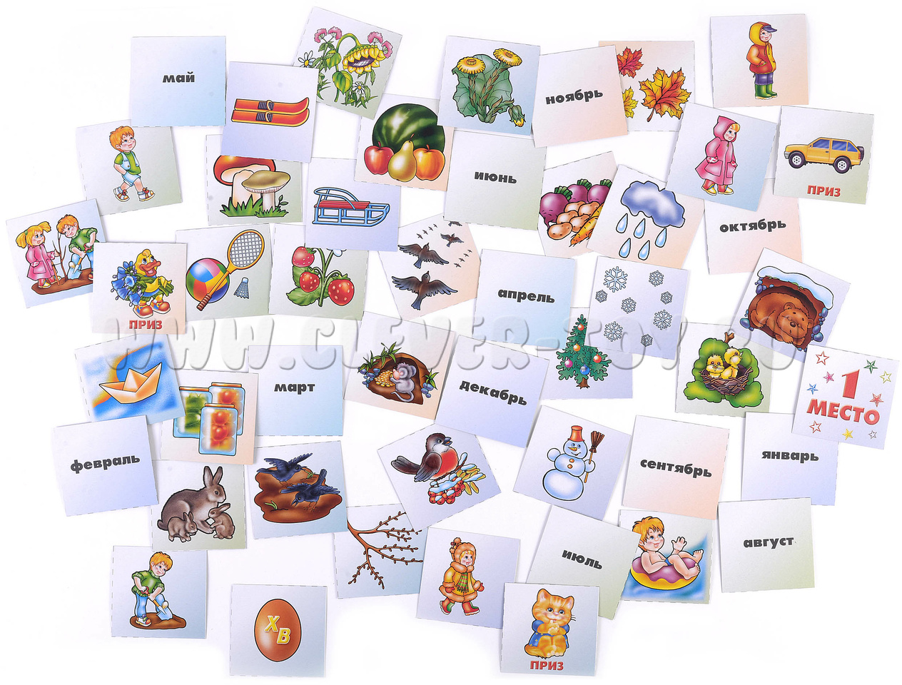 Перед началом игры родителю или педагогу необходимо разрезать карточки по пунктирным линиям. Большие карты (игровые поля) раздайте участникам поровну. 32 маленькие карточки с картинками перемешайте и выложите отдельно изображением вниз, так же поступите с карточками с названиями месяцев. По команде участники начинают выбирать из маленьких карточек подходящие к их игровым полям. Побеждает тот, кто сделал это правильно и быстрее всех остальных.