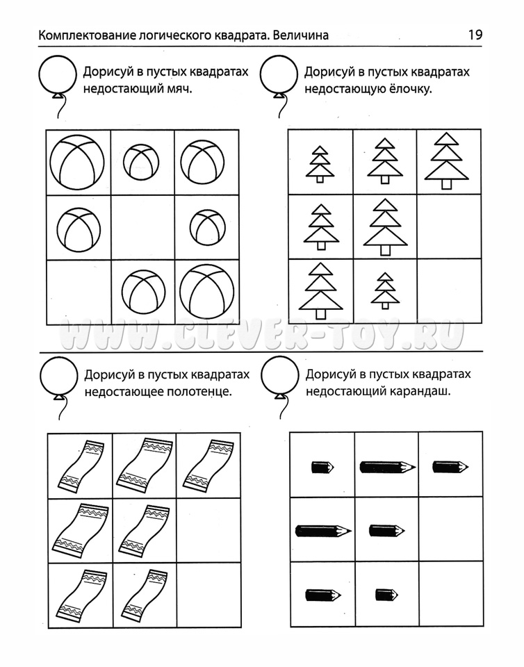 Они формулируются в виде конкретного действия с помощью глаголов: нарисуй, обведи и т.п.; имеют понятный результат, который ребёнок определяет с помощью критерия взрослого или по образцу. У него продолжают формироваться предпосылки учебной деятельности: понимание учебной задачи, самостоятельное решение и навык самоконтроля и самооценки. Логические задачи не требуют вычислений. Их решение направлено на поиск связей и отношений между отдельными предметами, явлениями, ситуациями.