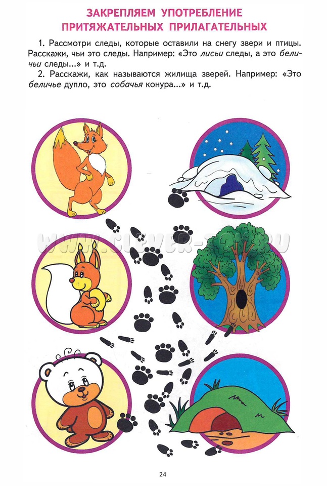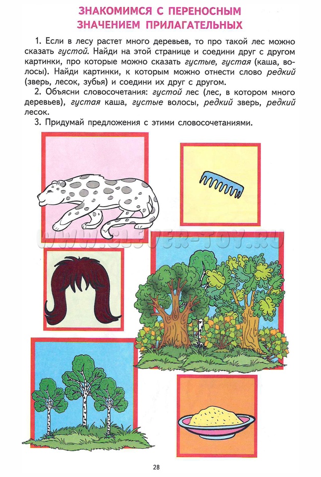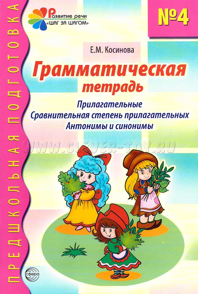 Материал, представленный в грамматической тетради № 4, усложняется: дети научатся образовывать относительные и притяжательные прилагательные, натренируются в образовании сравнительной степени прилагательных, обогатят словарный запас антонимами, синонимами и сложными прилагательными.