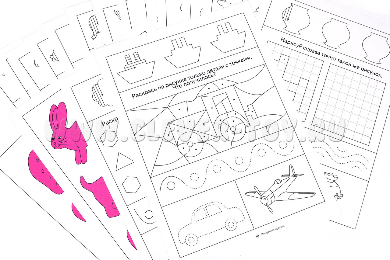Внутри вы найдете такие задания как: штриховка по образцу, продолжи узор, обведи по точкам, раскрась картинку, нарисуй точно такой же рисунок, дорисуй вторую половину.