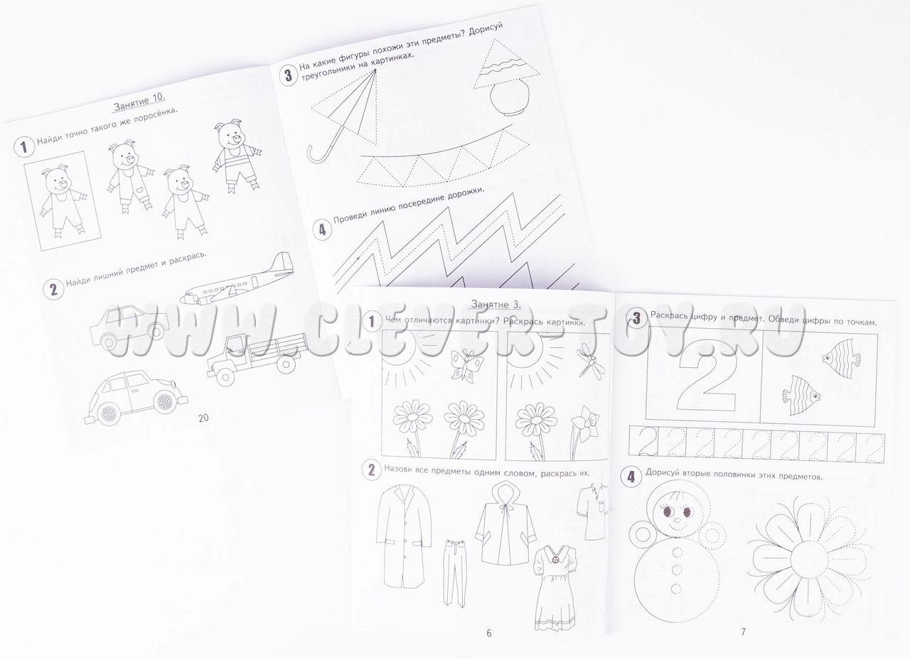 Набор из 2-х тетрадей из серии “Мои первые тетрадки” для занятий с детьми 4-х лет. Каждая часть включает по 15 занятий. Занятие включает в себя 4 разных упражнения (на внимательность, логику, математическое мышление и графику). Итого, 60 упражнений.
