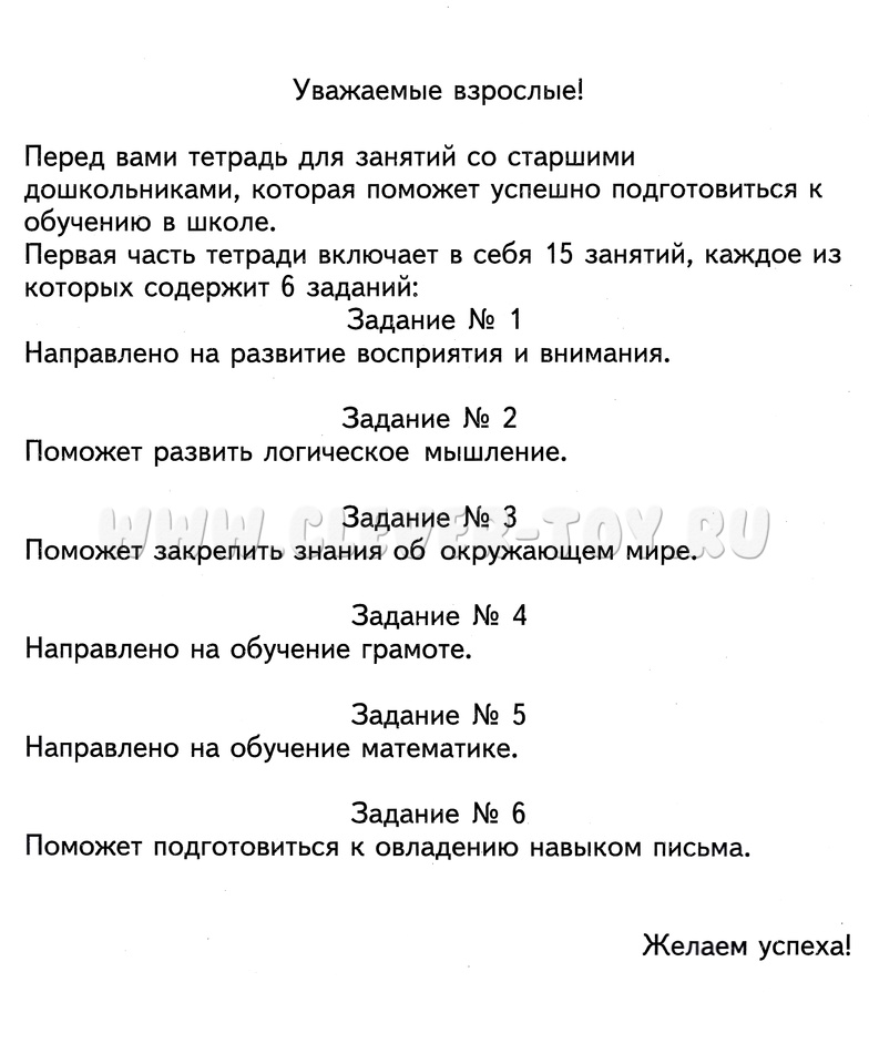 Первая часть из набора для успешной подготовки к школе старших дошкольников 5-6 лет. Тетрадь подразделена на 15 занятий, каждое из которых состоит из 6 заданий.