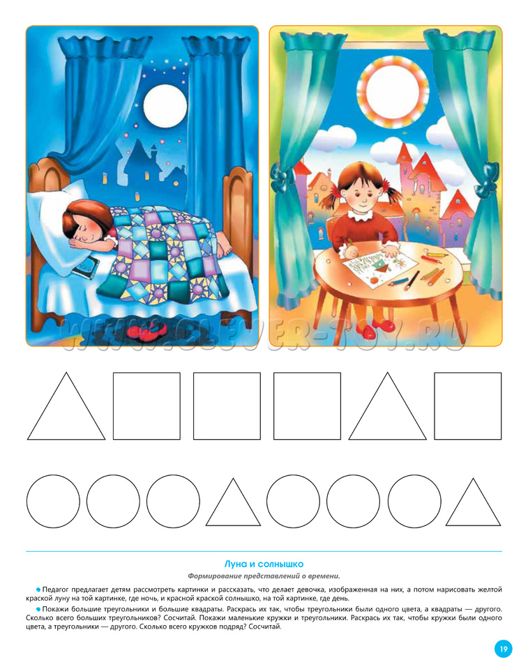 На следующий день продолжите работу на этой страничке: "Покажи большие шары. Покажи маленькие шары. Раскрась большие шары так, как показано. Раскрась маленькие шары так, как показано". (для раскрашивания лучше использовать либо восковые мелки, либо гуашь).